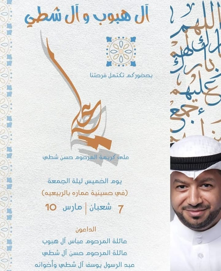 تحتفل عائلة آل هبوب وآل شطي في الربيعية مساء يوم الخميس 7 شعبان بزفاف الشاب علي عباس آل هبوب على كريمة المرحوم حسن آل شطي في حسينية عمارة بالربيعية وسط فرحة الأهل والأصدقاء ومحبي العريسين.