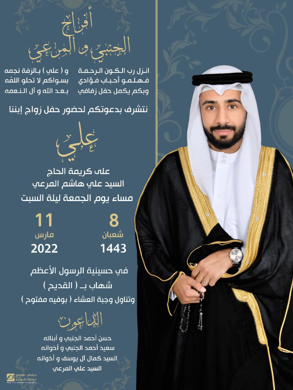 تحتفل عائلة الجنبي والمرعي في القديح مساء يوم الجمعة 8 شعبان بزفاف الشاب علي حسن أحمد الجنبي على كريمة السيد علي السيد هاشم المرعي في حسينية الرسول الأعظم «شهاب» بالقديح وسط فرحة الأهل والأصدقاء ومحبي العريسين.
