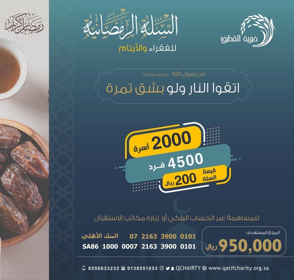 ودعت خيرية القطيف المحسنين وأهل الخير للمساهمة في دعم المشروع إسهامًا في توطيد وتعزيز روح التكافل الاجتماعي، وأوضحت أنه يأتي ضمن أنشطة الجمعية لتلبية احتياجات المستفيدين خلال الشهر الفضيل، سائلين الله أن يتقبل من المحسنين أعمالهم.