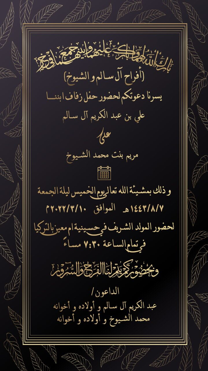 تحتفل عائلة آل سالم والشيوخ في تاروت مساء يوم الخميس 7 شعبان بزفاف المهندس الشاب علي عبد الكريم آل سالم على الدكتورة مريم كريمة الكاتب محمد عبد الغقفور الشيوخ، في حسينية أم معين بالتركيا وسط فرحة الأهل والأصدقاء ومحبي العريسين.