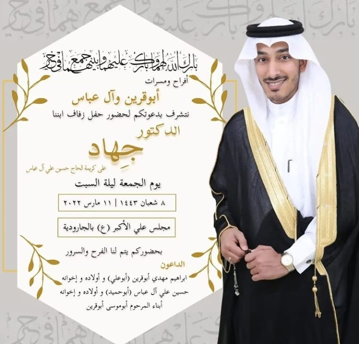 تحتفل عائلة أبو قرين وآل عباس في الجارودية مساء يوم الجمعة 8 شعبان بزفاف الدكتور الشاب جهاد ابراهيم مهدي أبو قرين على كريمة الحاج حسين علي آل عباس في مجلس علي الأكبر بالجارودية وسط فرحة الأهل والأصدقاء ومحبي العريسين.
