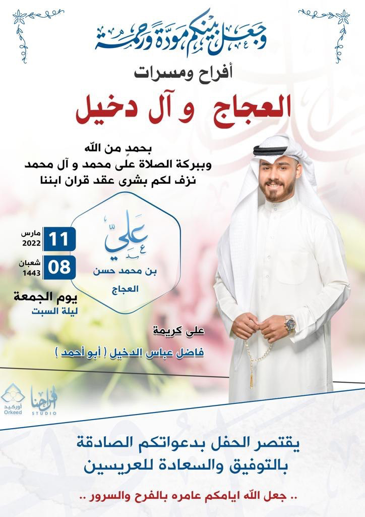 تحتفل عائلة العجاج وآل دخيل في صفوى مساء يوم الجمعة 8 شعبان بعقد قران الشاب علي محمد حسن العجاج على كريمة الحاج فاضل عباس آل دخيل «أبو أحمد» وسط فرحة الأهل والأصدقاء ومحبي العريسين.