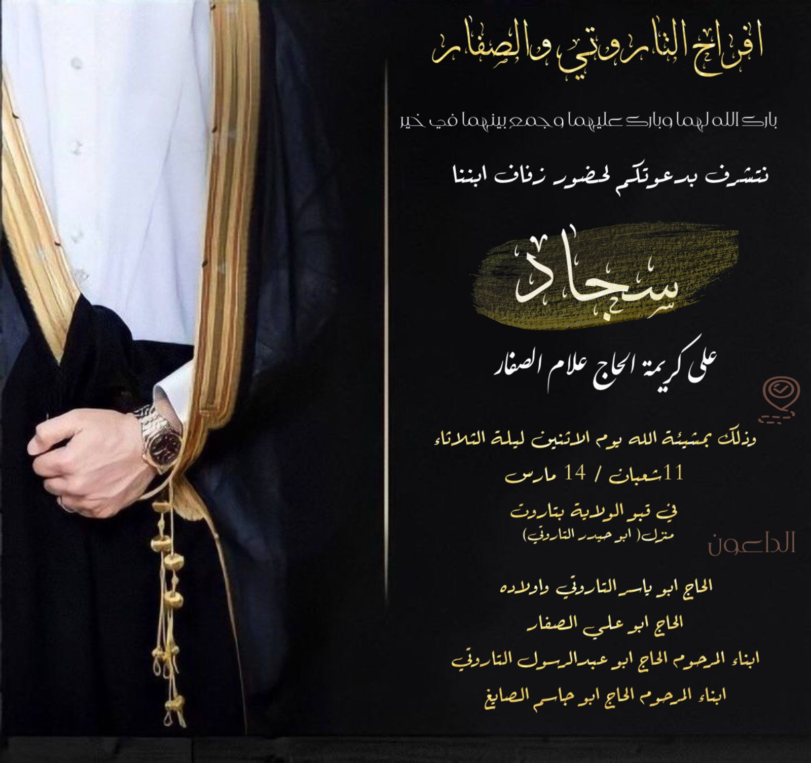 تحتفل عائلة التاروتي والصفار في تاروت مساء يوم الإثنين 11 شعبان بزفاف الشاب سجاد ابراهيم عبدالله ابراهيم التاروتي على كريمة الحاج علام الصفار «أبو علي» في قبو الولاية بتاروت منزل الحاج محمد التاروتي «أبو حيدر» وسط فرحة الأهل والأصدقاء ومحبي العريسين.