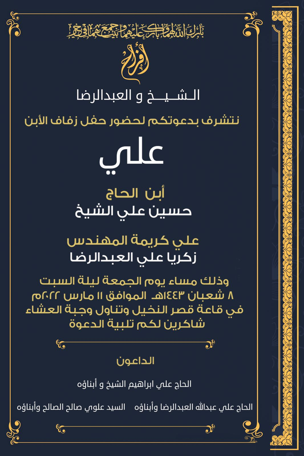 احتفلت عائلة الشيخ والعبد الرضا في سيهات مساء يوم الجمعة 8 شعبان بزفاف الشاب علي حسين علي ابراهيم الشيخ على كريمة المهندس زكريا علي عبدالله العبد الرضا في قاعة قصر النخيل وسط فرحة الأهل والأصدقاء ومحبي العريسين.
