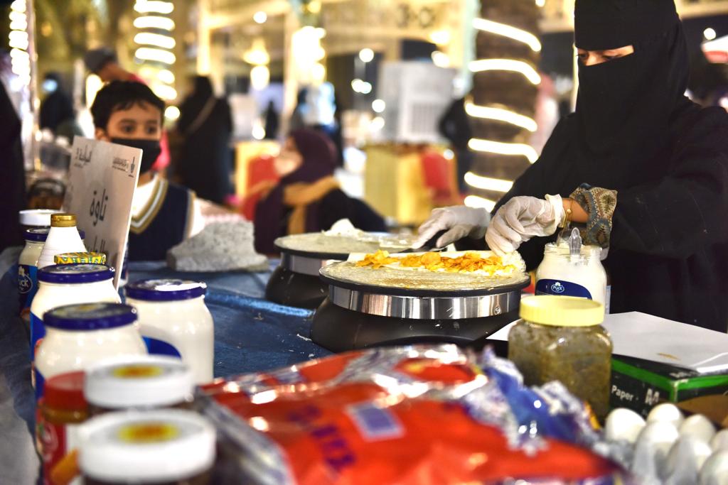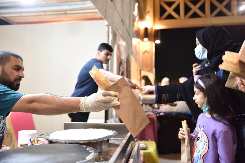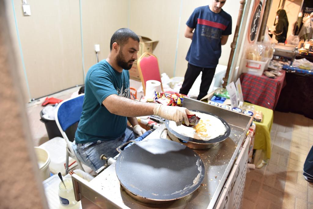 وتميزت أم إسماعيل المشهد مع بناتها بفرد عجينة التاوة بنكهة ”البيتزا“ وغيرها، فيما يتوسط «أبو كرار» أركان الأكلات الشعبية ليبيع التاوه بنكهة ”النوتيلا“ والأجبان.