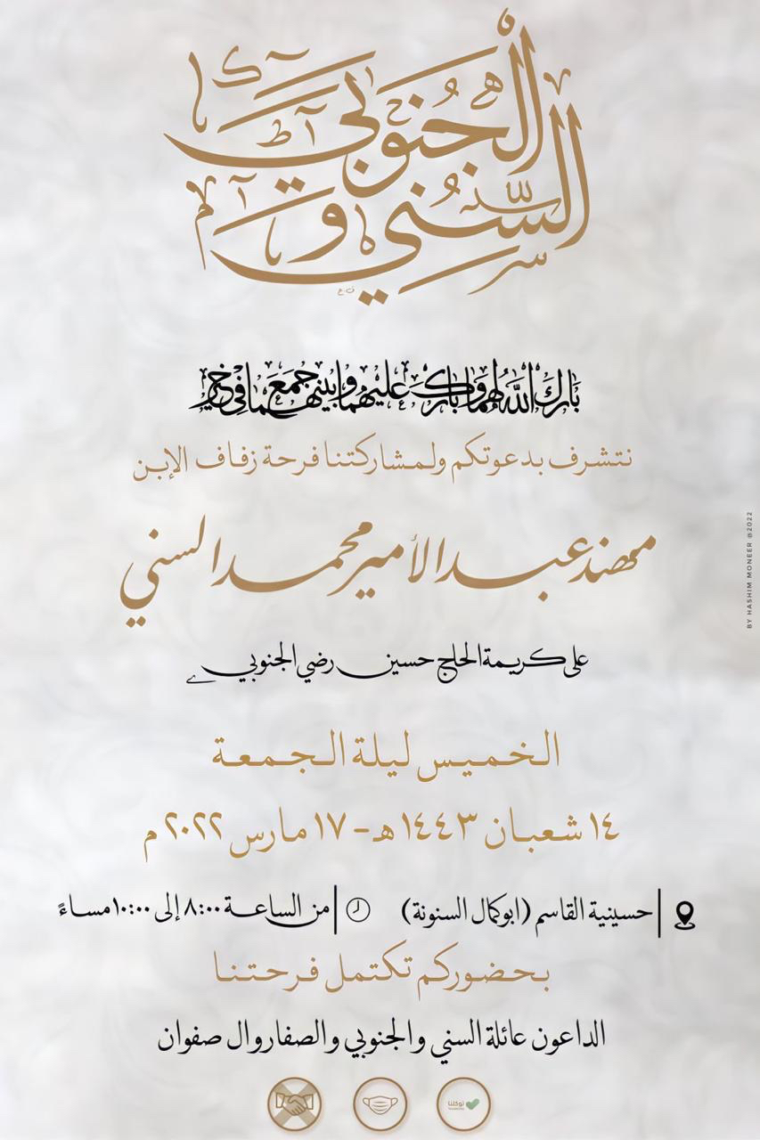 تحتفل عائلة السني والجنوبي في تاروت مساء يوم الخميس 14 شعبان بزفاف الشاب مهند عبد الأمير محمد السني على كريمة الحاج حسين رضي الجنوبي في حسينية القاسم «أبو كمال السنونة» بالتركيا وسط فرحة الأهل والأصدقاء ومحبي العريسين.