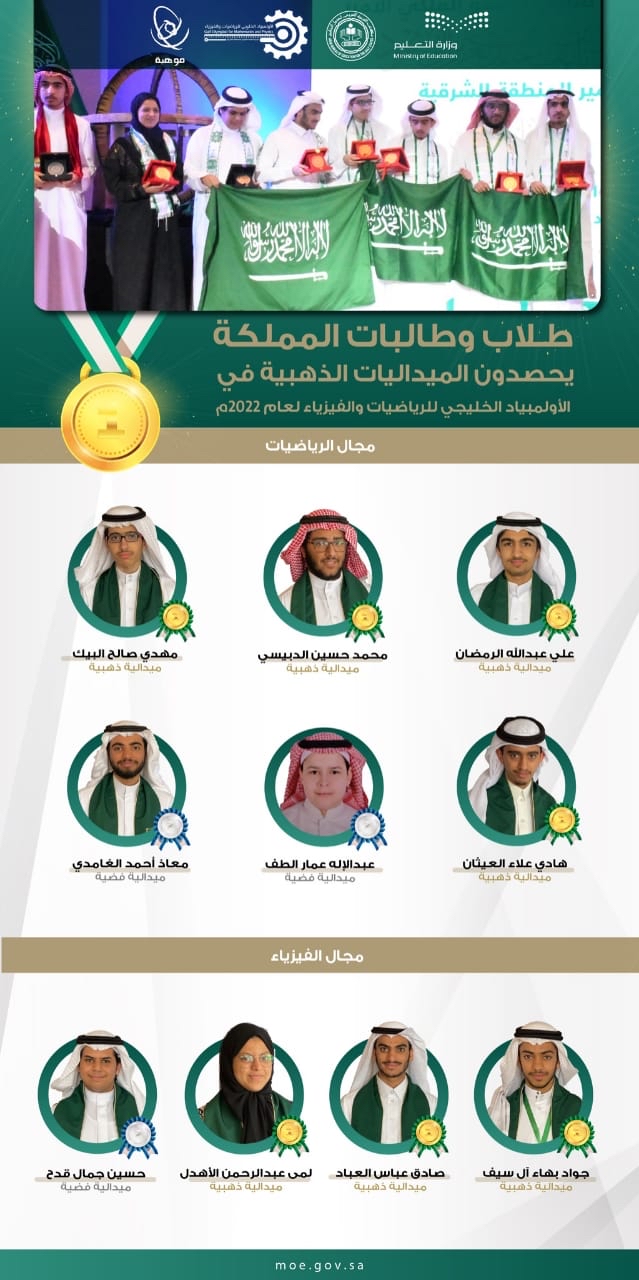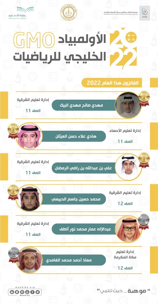 جاء ذلك في نتائج هذا الأولمبياد، التي أعلنت يوم الخميس والتي كشفت عنها مؤسسة الملك عبدالعزيز ورجاله للموهبة والإبداع «موهبة» بالرياض، ومكتب التربية العربي لدول الخليج بالرياض - الجهة المنظمة لهذا الأولمبياد.