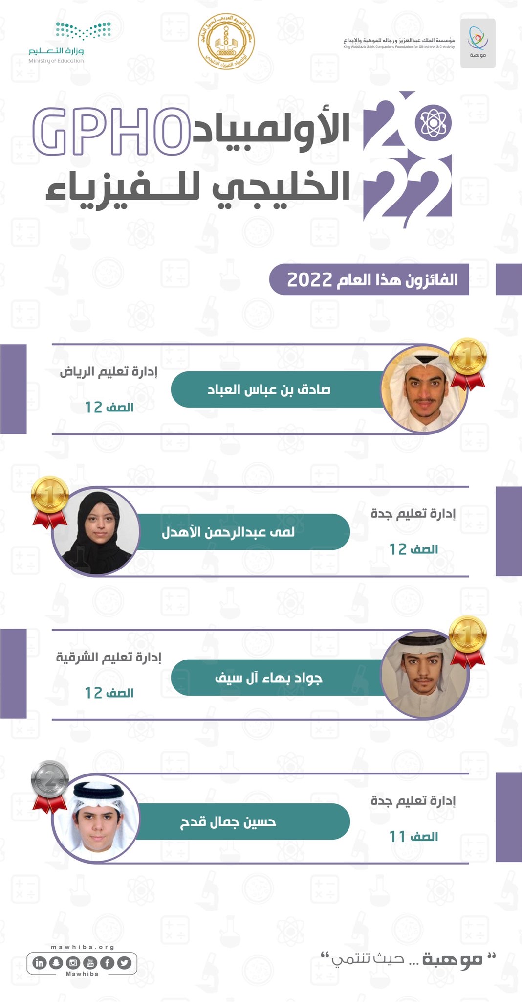 وكشفت مؤسسة الملك عبدالعزيز ورجاله للموهبة والإبداع «موهبة» بالرياض، والجهة المنظمة: مكتب التربية العربي لدول الخليج بالرياض عن نتائج هذا الأولمبياد اليوم الخميس.