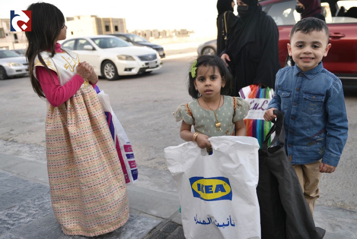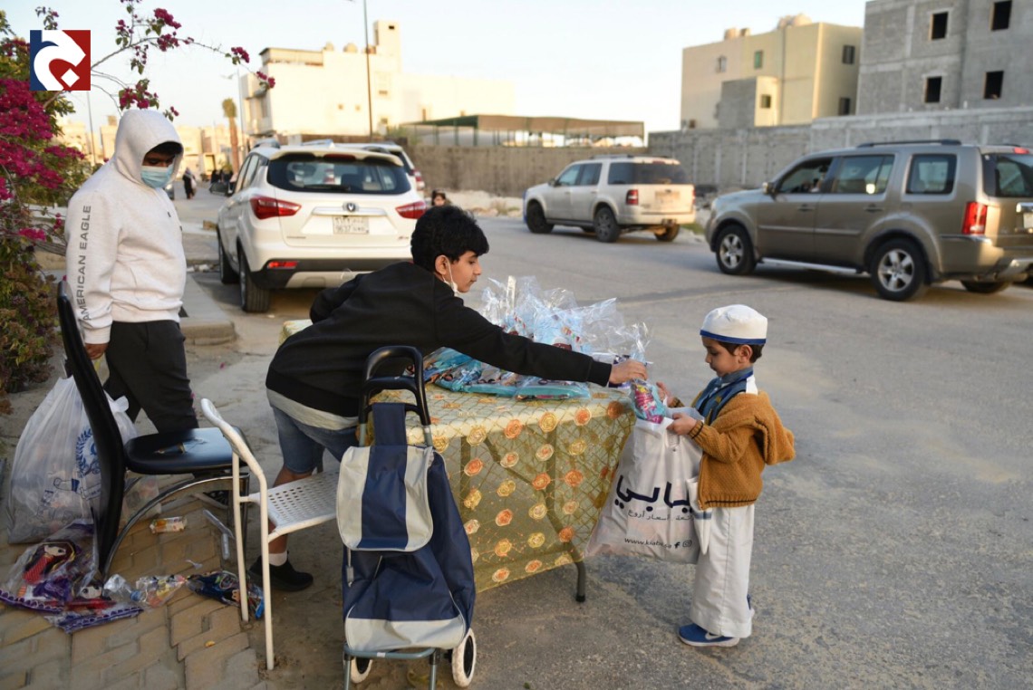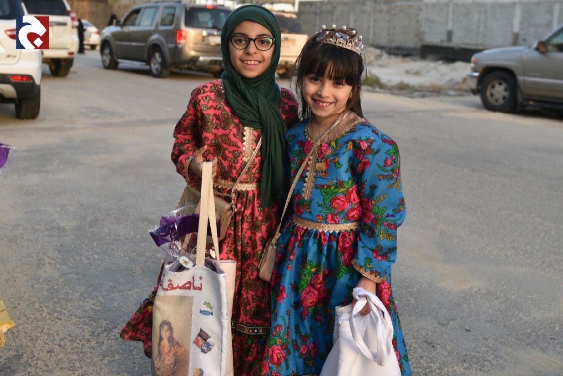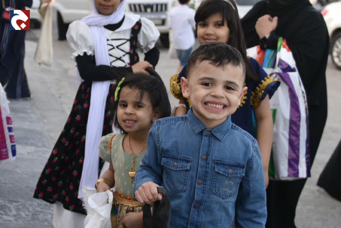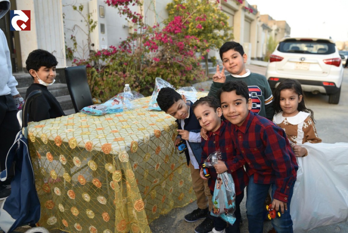 وانتشر الأطفال المتزينين بالثياب الخاصة بالقرقيعان وهم يحملون الأكياس مارين بمنازل الأقارب والجيران لجمع الهدايا والحلويات وهم يرددون بصوت مسموع ”ناصفة حلاوة اعطونا الله يعطيكم“.