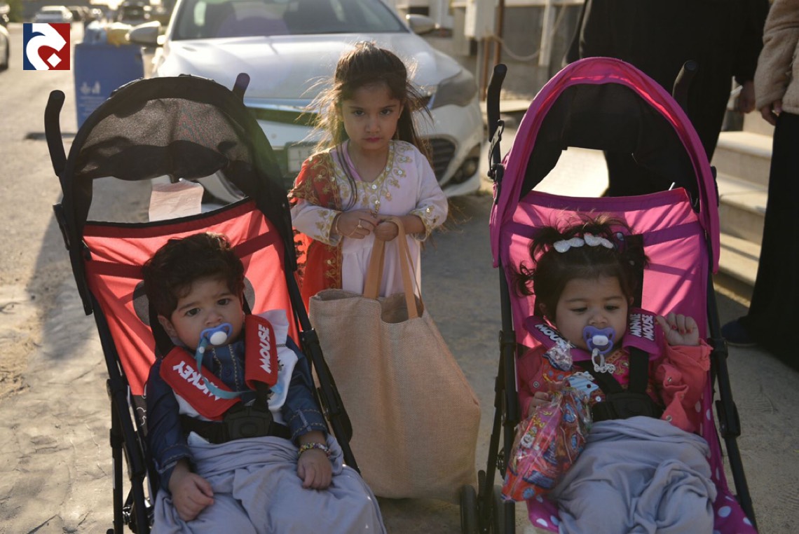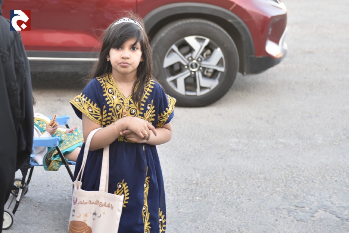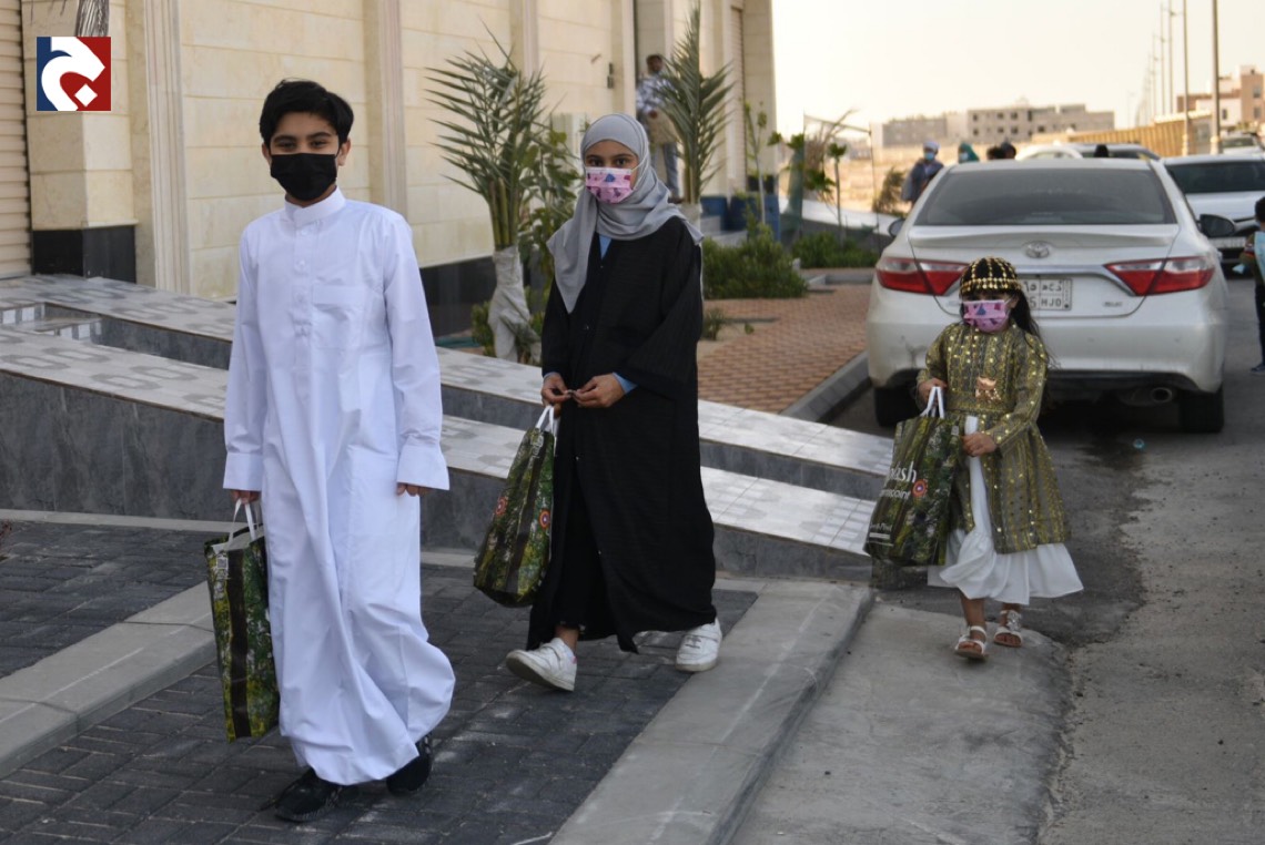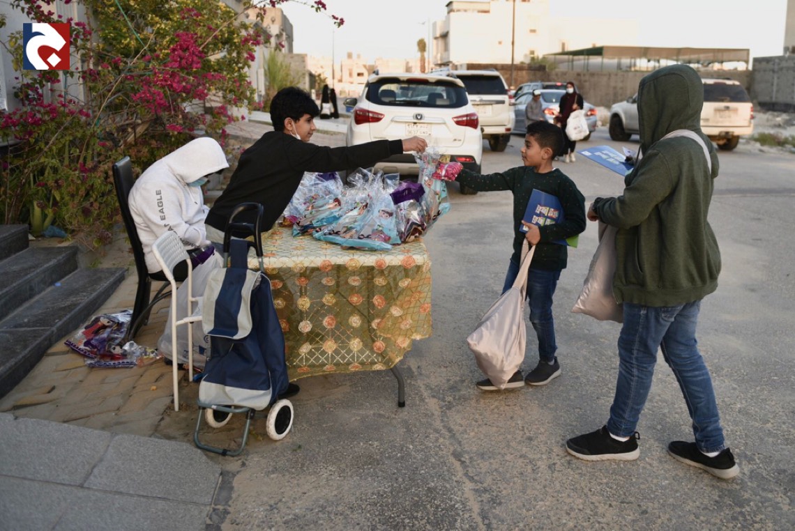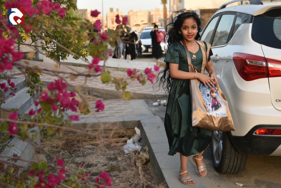 وانتشر الأطفال المتزينين بالثياب الخاصة بالقرقيعان وهم يحملون الأكياس مارين بمنازل الأقارب والجيران لجمع الهدايا والحلويات وهم يرددون بصوت مسموع ”ناصفة حلاوة اعطونا الله يعطيكم“.