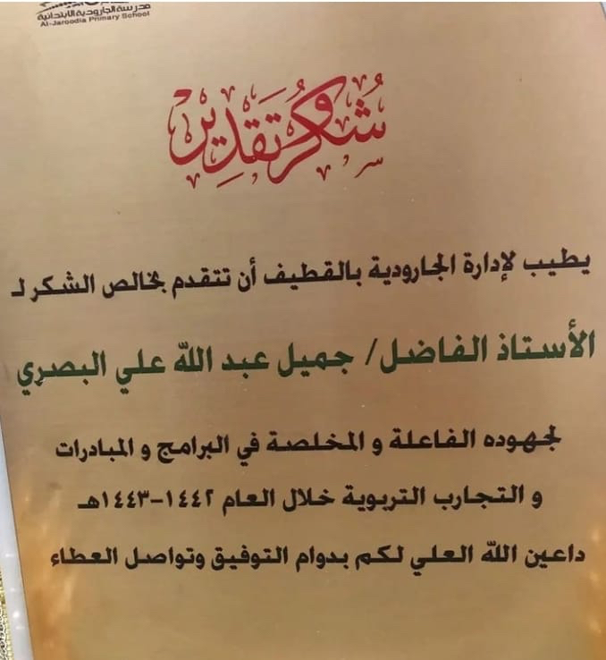 كرمت مدرسة الجارودية الإبتدائية للبنين المعلم جميل عبدالله علي البصري نظير جهوده الفاعلة والمخلصة في البرامج والمبادرات والتجارب التربوية للعام الدراسي 1442- 1443.