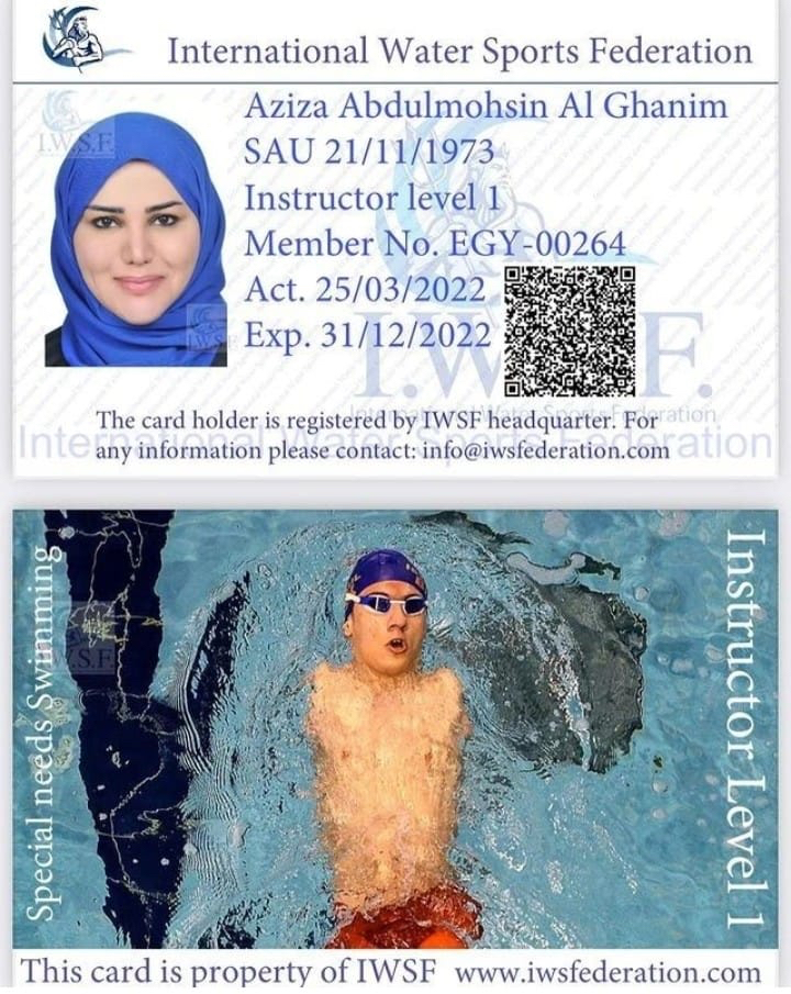 حصلت الشابة عزيزة عبد المحسن الغانم على رخصة تدريب السباحة للمعاقين وذوي الاحتياجات الخاصة من الإتحاد الدولي للرياضات المائية ”International Water Sports Federation IWSF“.