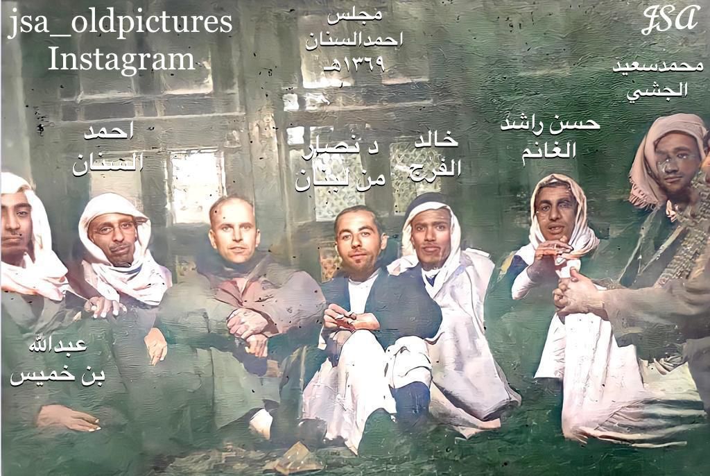 في مجلس أحمد بن حسين السنان «أبو عبد الغني». من اليمين الشاعر محمد سعيد الجشي وحسن راشد الغانم والشاعر خالد الفرج ود. أمين نصار وزائر أمريكي وأحمد حسين السنان وعبد الله بن خميس.