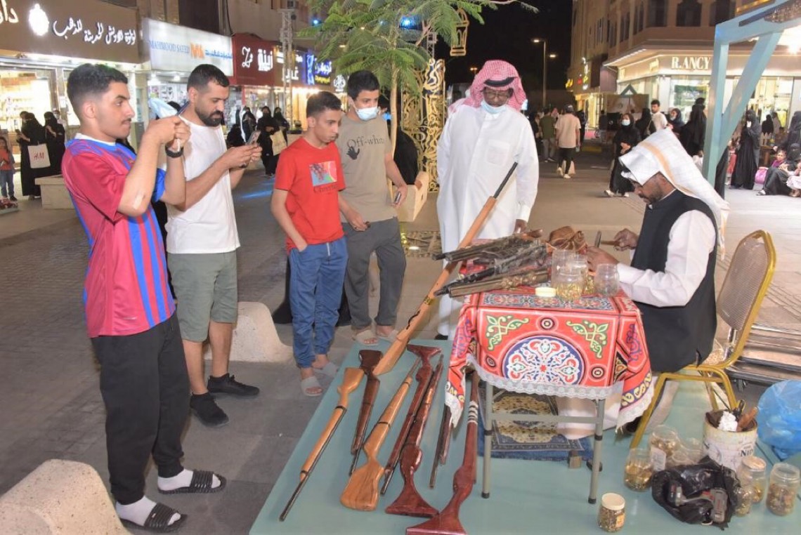 وحققت معارض الحرف اليدوية القديمة والأركان التراثية بالمهرجان اقبالا متميزاً من الزوار الذين شاركوا كبار السن من الحرفيين باستكمال منتجاتهم المتنوعة بين السعفيات والسفن والأسلحة القديمة والخزفيات النابعة من واقع البيئة السعودية، ورغم اندثار بعض هذه الحرف التقليدية إلا أنها ظلت صامدة لدى أصحابها يتوارثها الأجيال رغم تطور الحياة لتصبح مصدر رزقهم وإبداعاتهم الفنية.