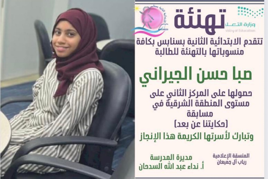 وحصلت الفائزة صبا حسن صالح الجيراني من المدرسة الإبتدائية الثانية بسنابس، على المركز الثاني ومثلت القطيف ضمن 5 فائزين تم تكريمهم الليلة.