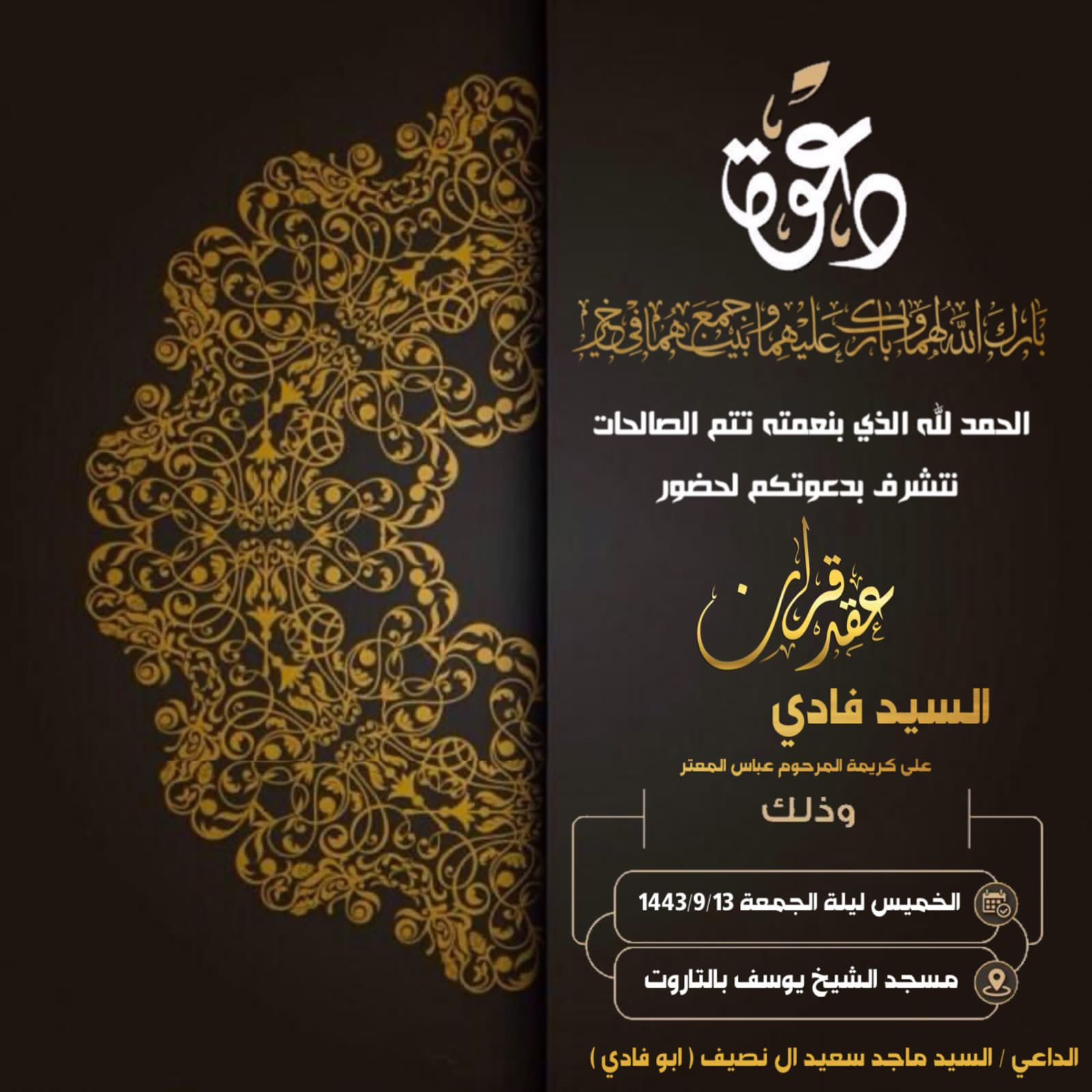 تحتفل عائلة آل نصيف والمعتر في تاروت مساء يوم الخميس 13 رمضان بعقد قران الشاب السيد فادي السيد ماجد السيد سعيد آل نصيف على كريمة الحاج المرحوم عباس المعتر في مسجد الشيخ يوسف بتاروت وسط فرحة الأهل والأصدقاء ومحبي العريسين.