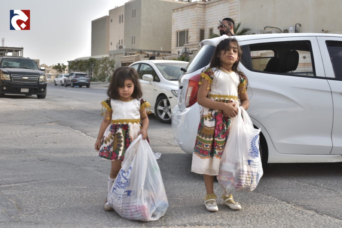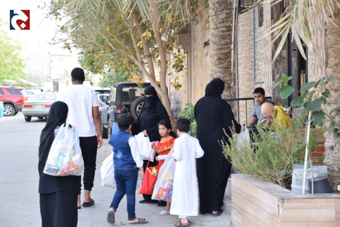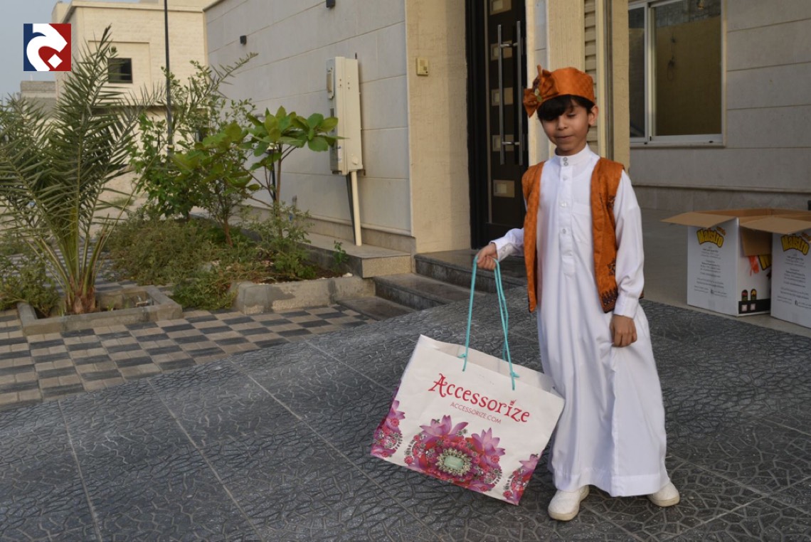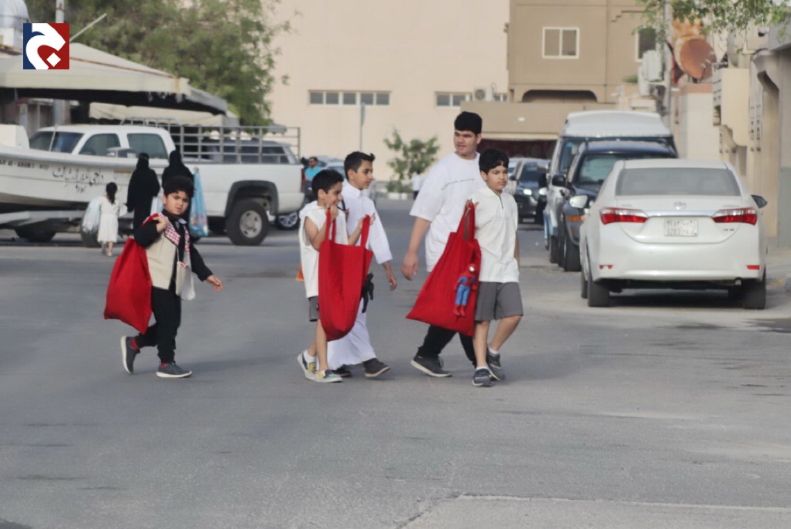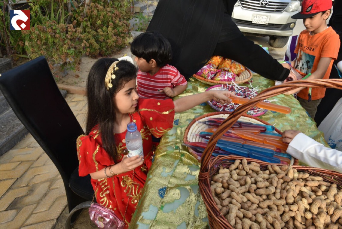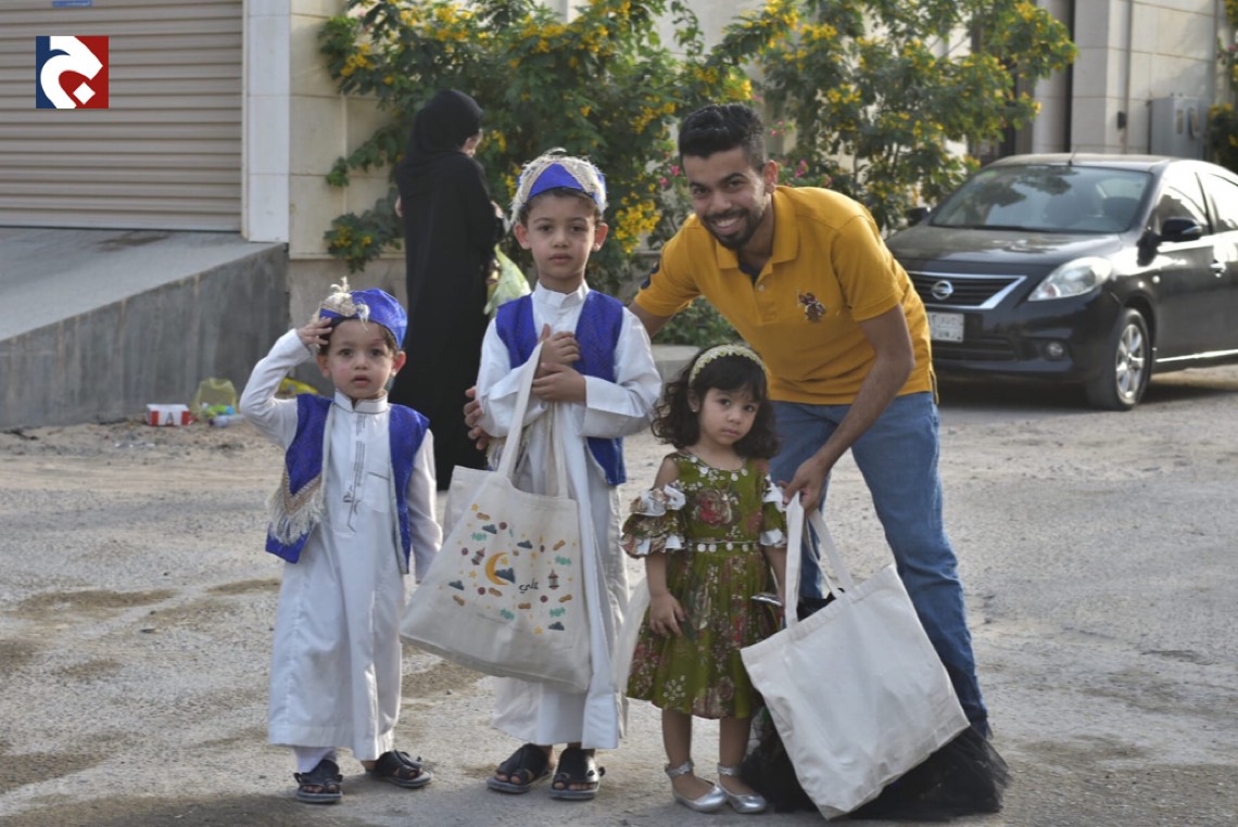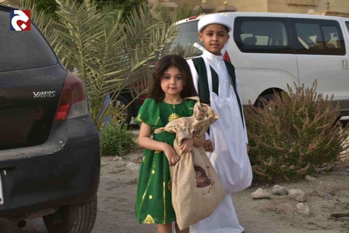 وانتشر الأطفال المتزينين بالثياب الخاصة بالقرقيعان وهم يحملون الأكياس مارين بمنازل الأقارب والجيران لجمع الهدايا والحلويات وهم يرددون بصوت مسموع ”ناصفة حلاوة أعطونا الله يعطيكم“.