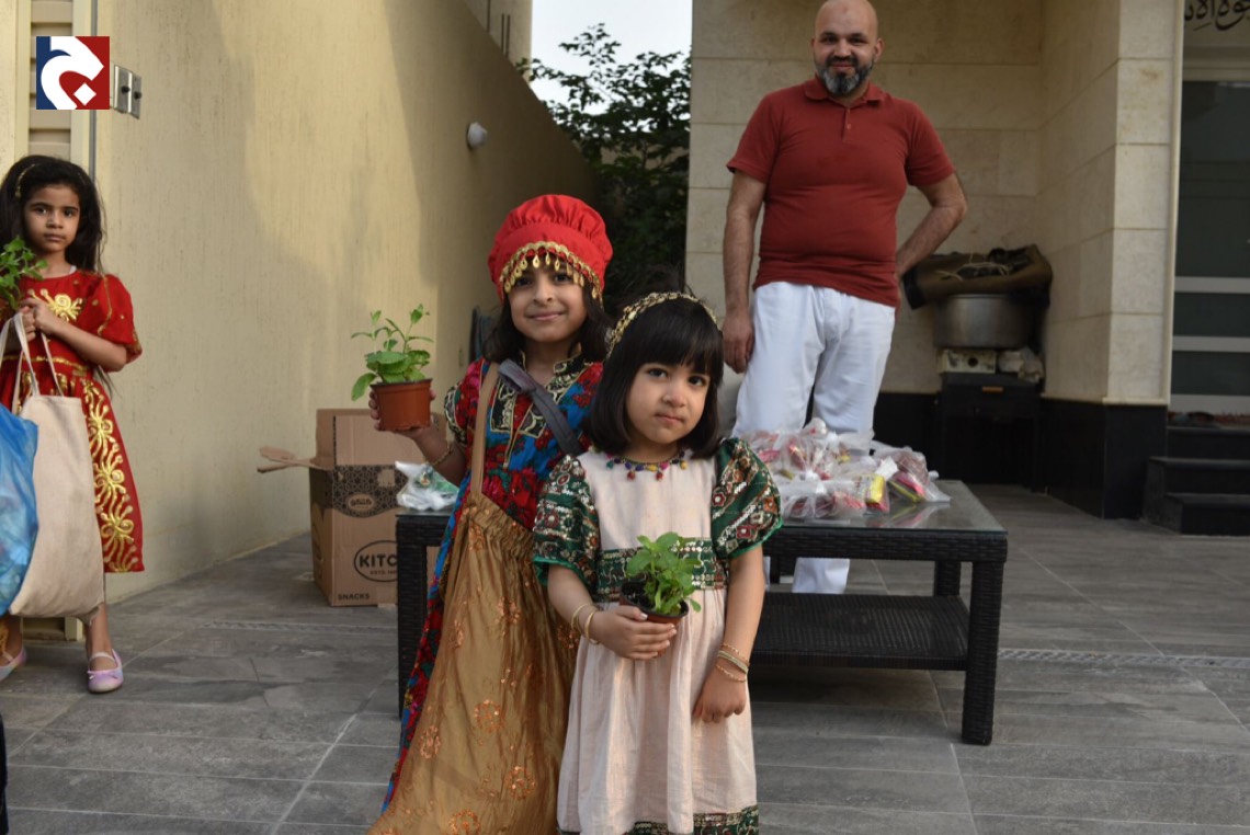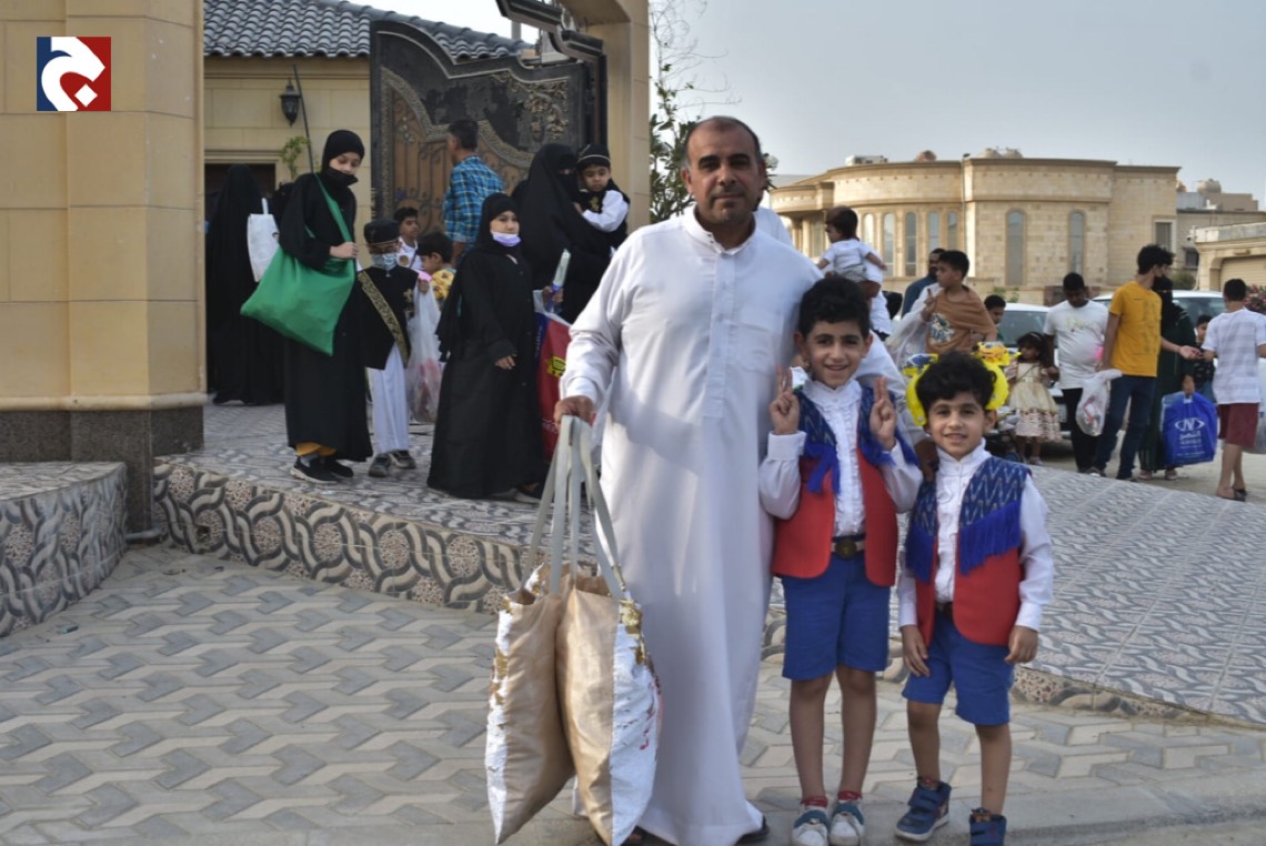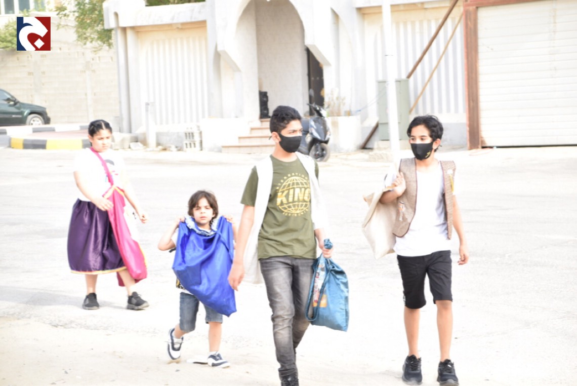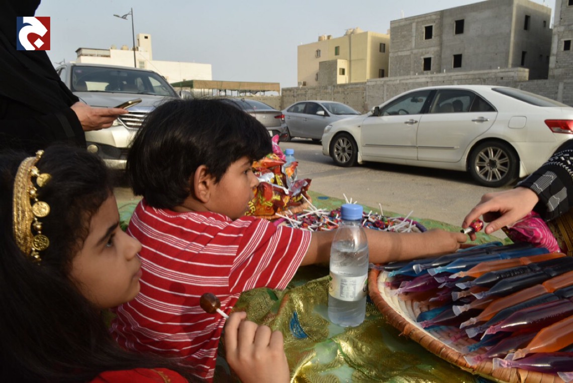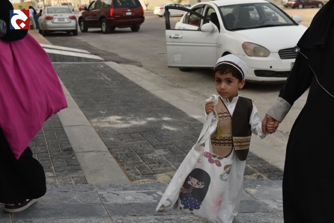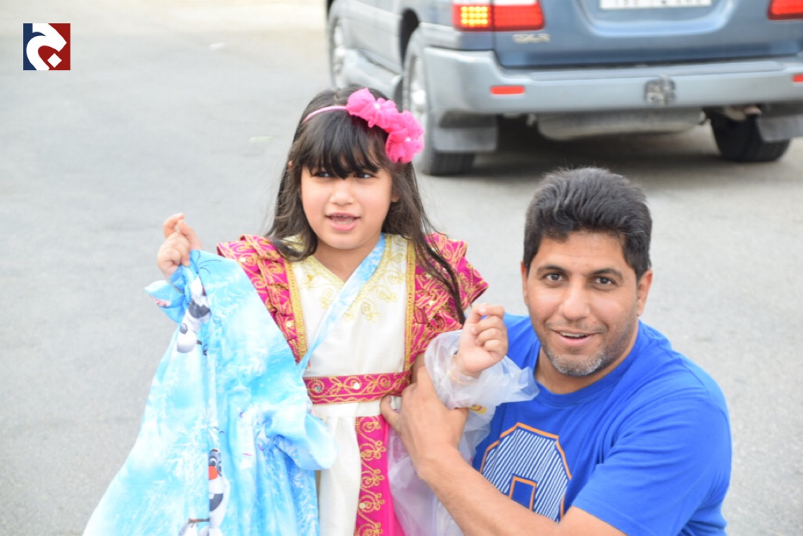 وانتشر الأطفال المتزينين بالثياب الخاصة بالقرقيعان وهم يحملون الأكياس مارين بمنازل الأقارب والجيران لجمع الهدايا والحلويات وهم يرددون بصوت مسموع ”ناصفة حلاوة أعطونا الله يعطيكم“.