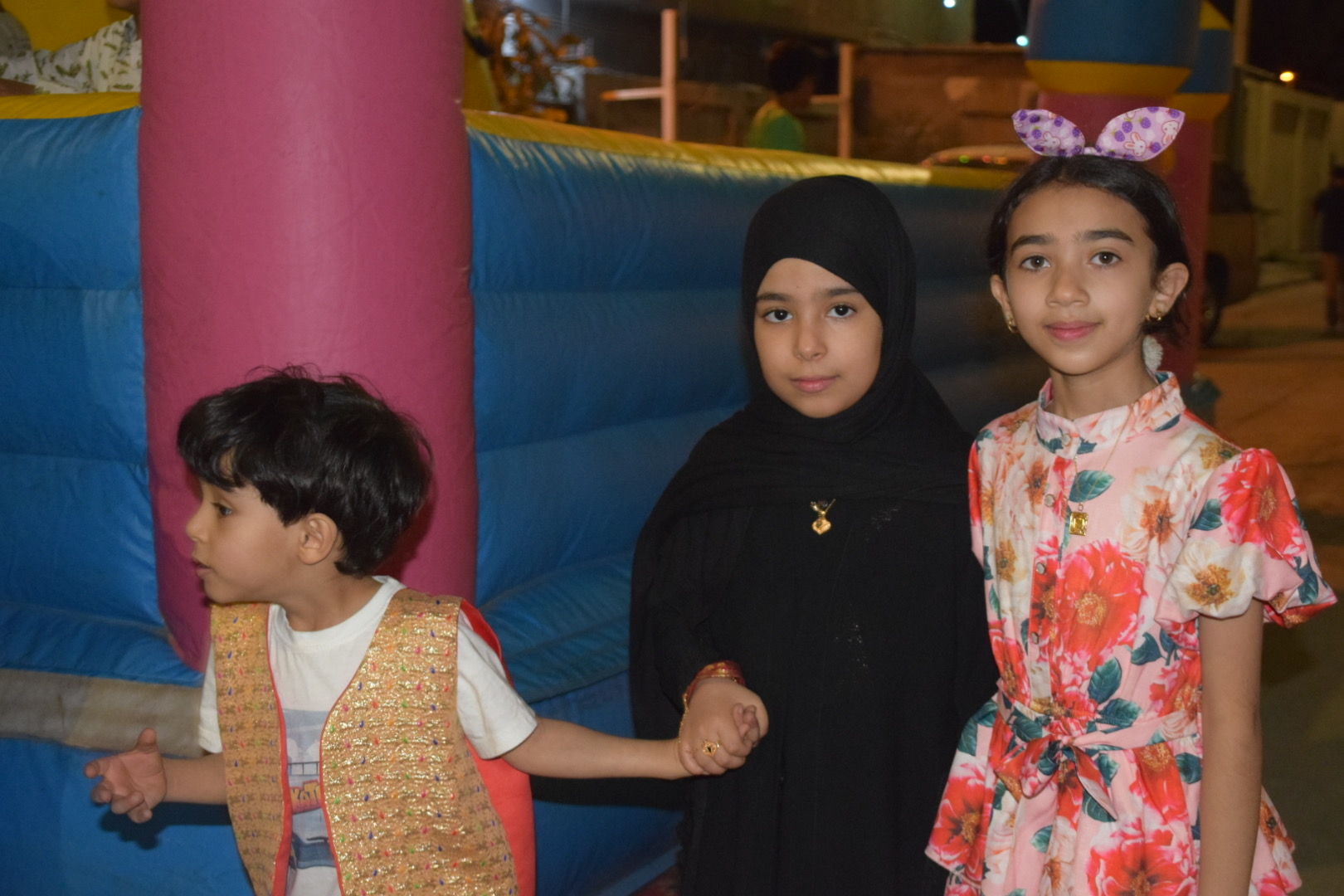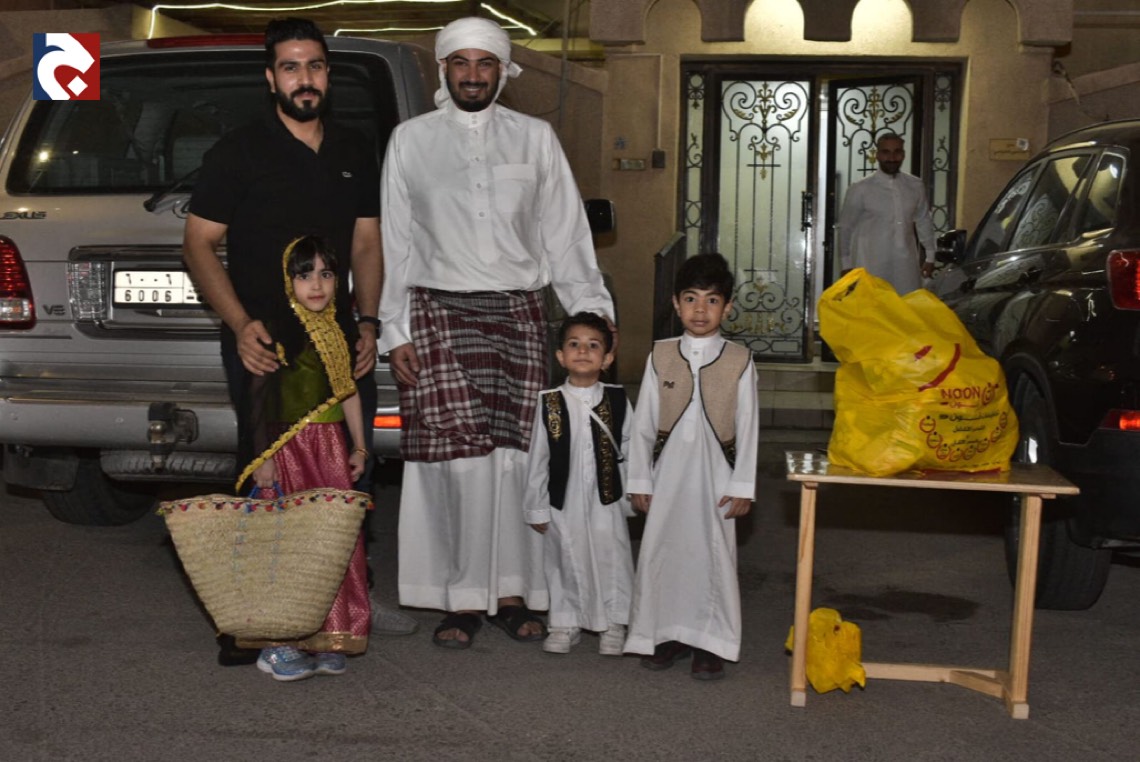 وانتشر الأطفال المتزينين بالثياب الخاصة بالقرقيعان وهم يحملون الأكياس مارين بمنازل الأقارب والجيران لجمع الهدايا والحلويات وهم يرددون بصوت مسموع ”ناصفة حلاوة أعطونا الله يعطيكم“.