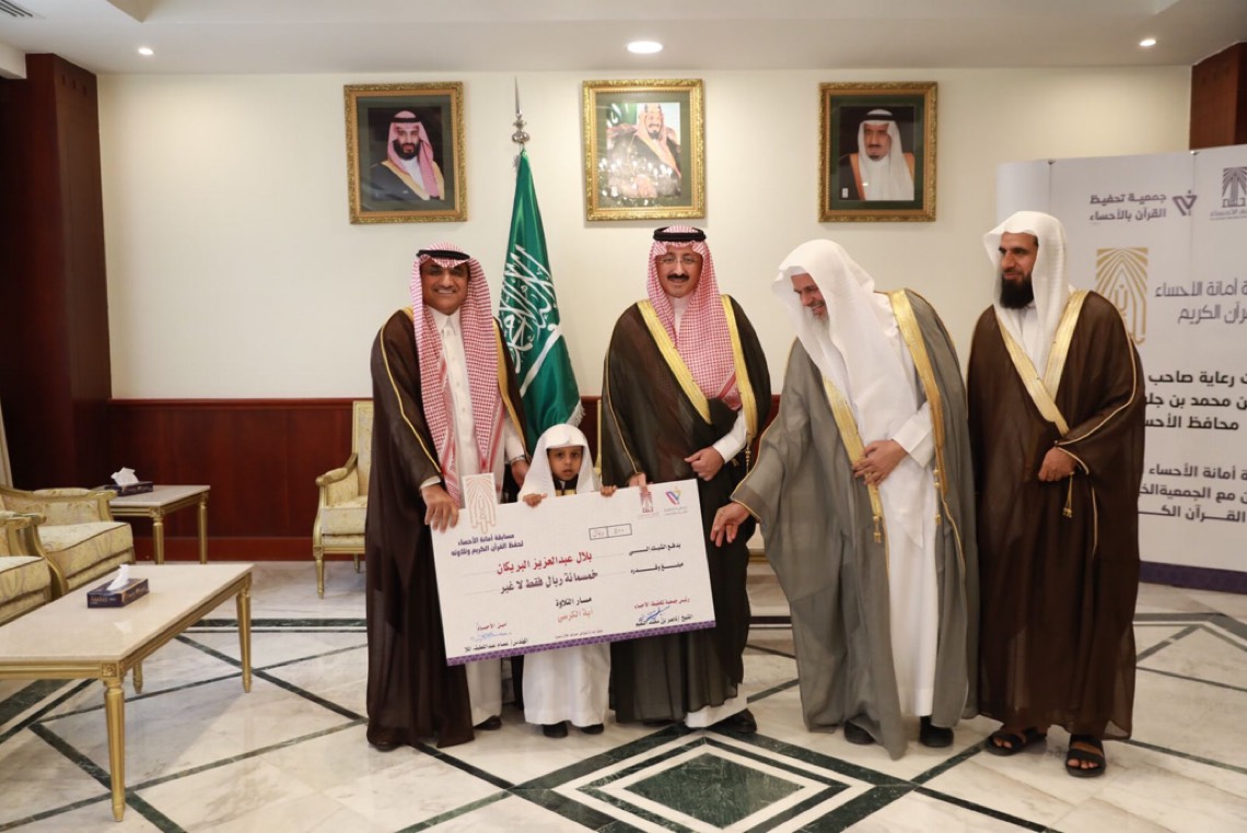 كرّم الأمير بدر بن محمد بن جلوي محافظ الأحساء، الرئيس الفخري لمجلس إدارة الجمعية الخيرية لتحفيظ القرآن الكريم بالمحافظة، اليوم، الفائزين في مسابقة أمانة الأحساء بالتعاون مع الجمعية لحفظ القرآن الكريم وتلاوته.