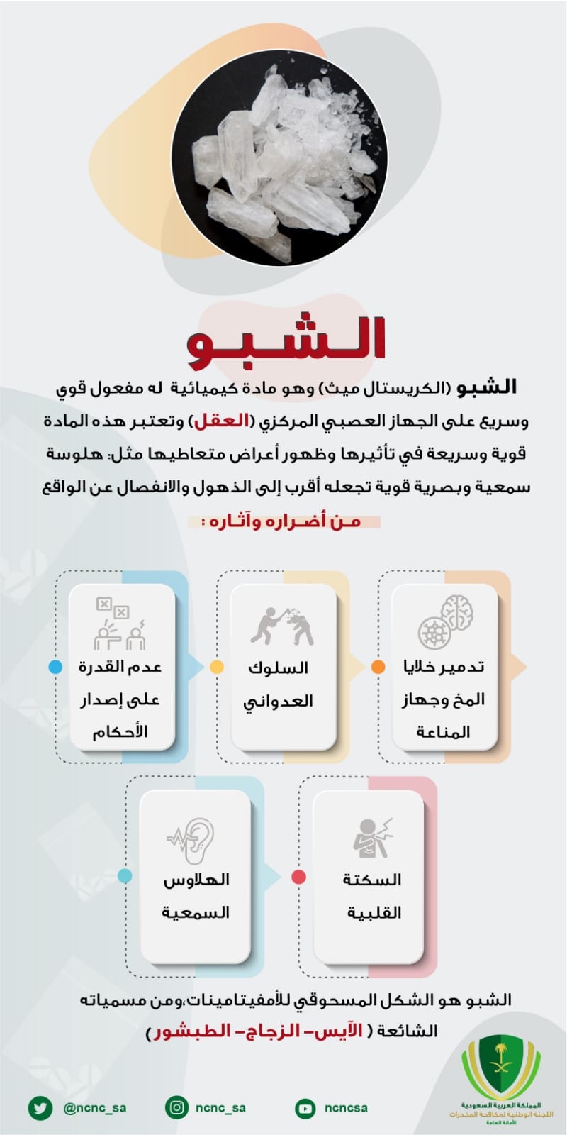 كشفت اللجنة الوطنية لمكافحة المخدرات عن أن الشبو ”الكريستال ميث“ مادة كيميائية سريعة في تأثيرها، تدمر خلايا المخ وجهاز المناعة.