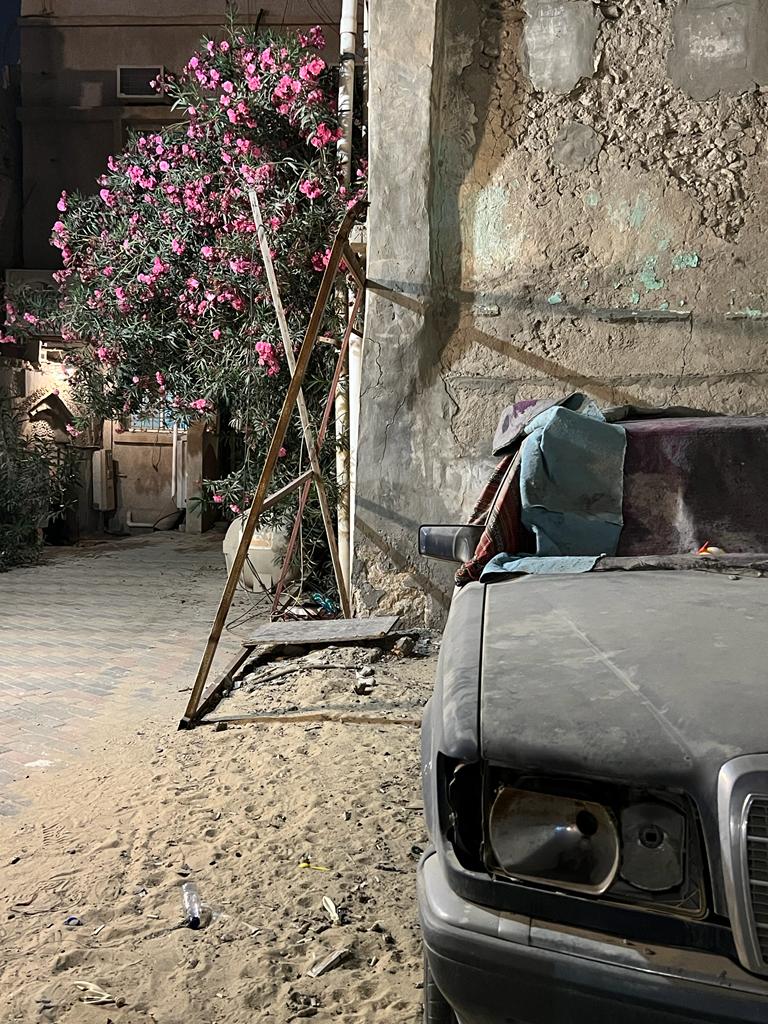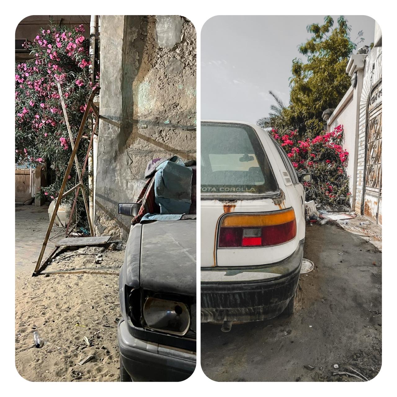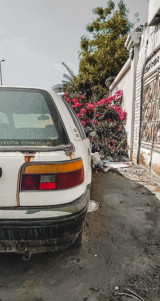 بينما كنتُ أتجول في منطقة تراثية بالقطيف وقعت عيناي مصادفةً على سيارة قديمة وتالفة من نوع ”مرسيدس“؛ فالتقطت صوراً لها لإبلاغ البلدية عنها كونها تشوّهاً بصرياً، وحينما التقطت صورة ”للسيارة التالفة“ من زاوية أخرى مع شجرة قُربها كانت يانعة بالزهور تحولت الصورة المشوهة للوحة جمالية!!