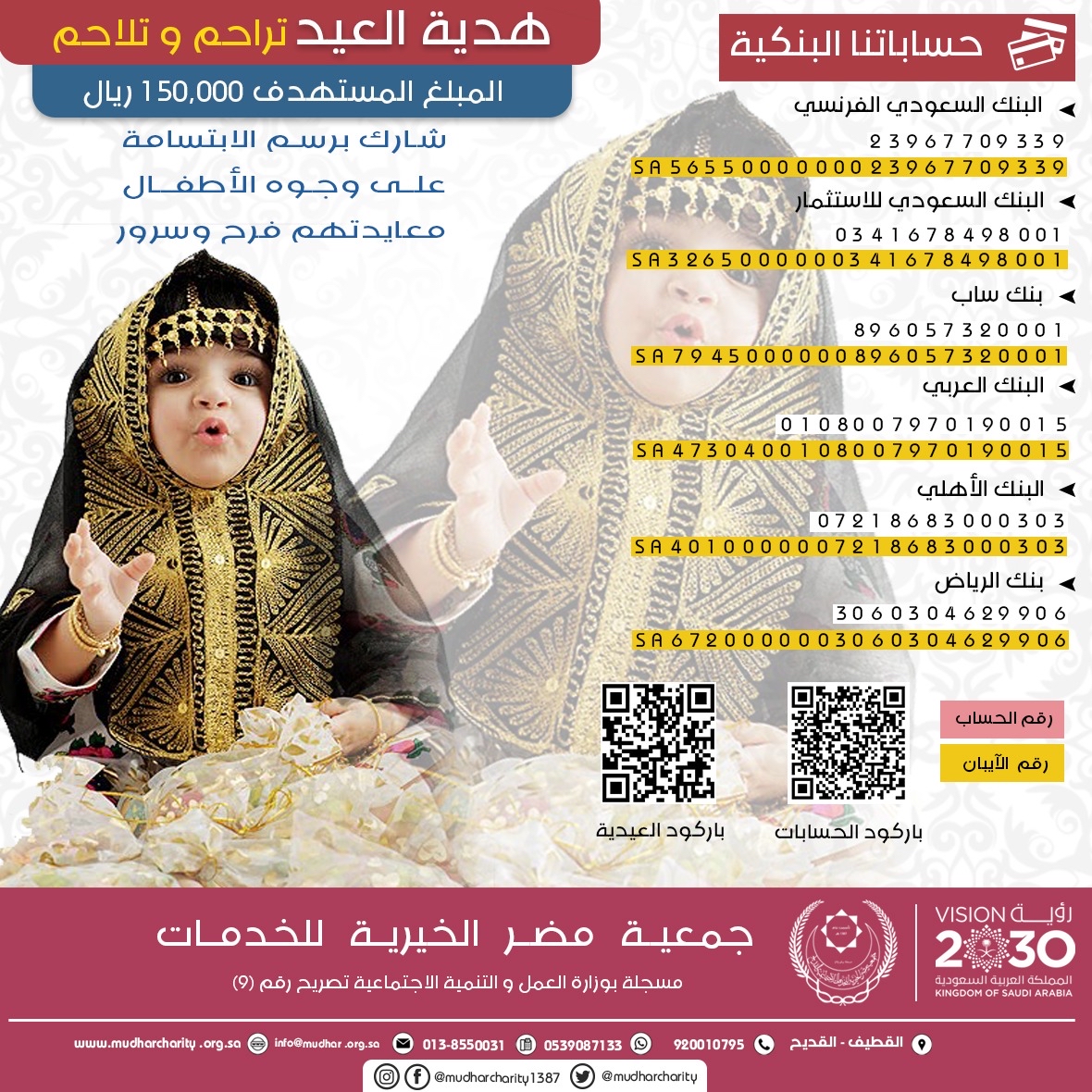 رصدت جمعية مضر الخيرية، مبلغ 150 ألف ريال ميزانية للعيدية، وذلك مع قرب انتهاء شهر رمضان المبارك، لمعايدة الأسر المتعففة ورسم البسمة على وجوه أطفالهم.