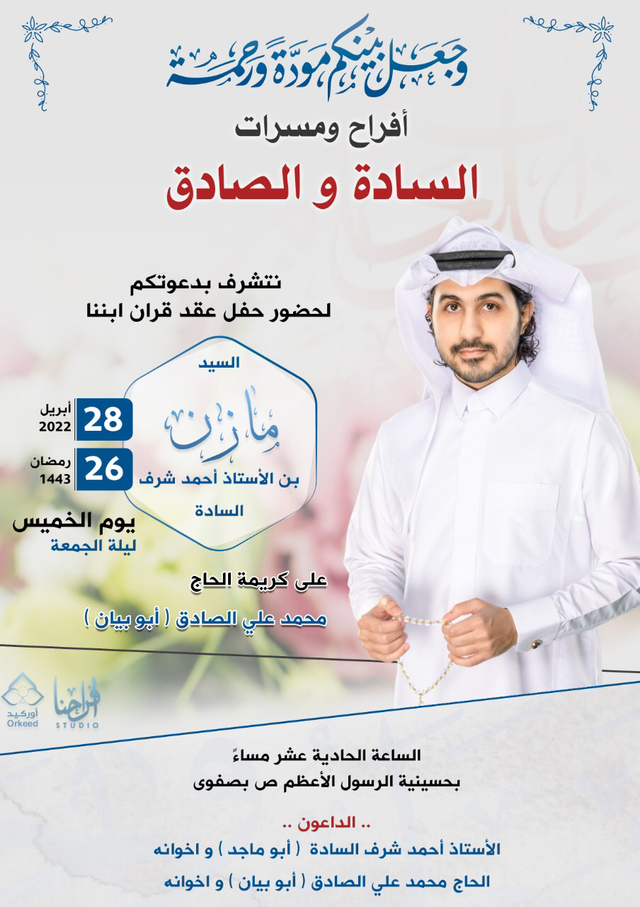تحتفل عائلة السادة والصادق في صفوى مساء يوم الخميس 26 رمضان بعقد قران الشاب السيد مازن السيد أحمد السيد شرف السادة على كريمة الحاج محمد علي الصادق «أبو بيان» بحسينية الرسول الأعظم بصفوى وسط فرحة الأهل والأصدقاء ومحبي العريسين.