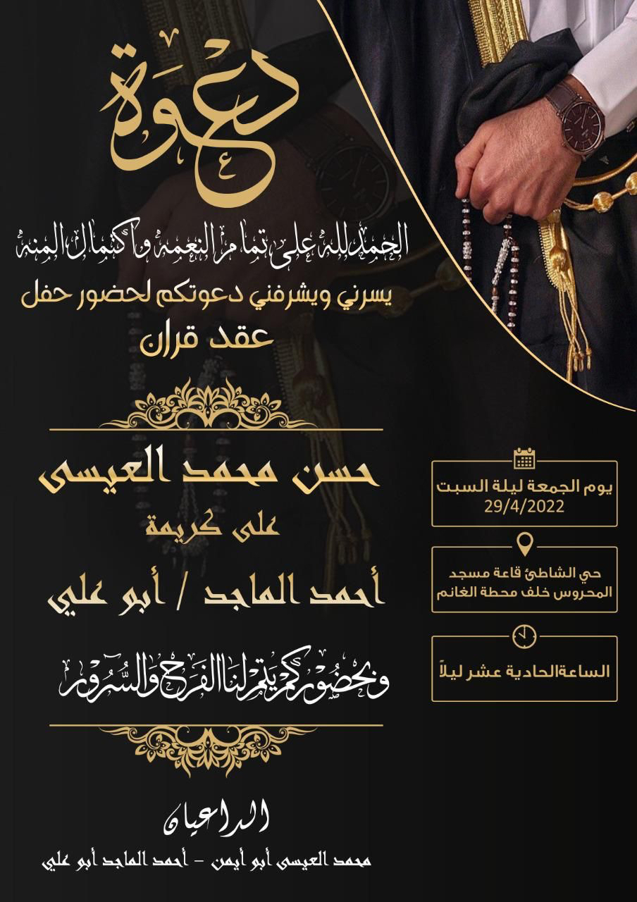 احتفلت عائلة العيسى والماجد في القطيف مساء يوم الجمعة 27 رمضان بعقد قران الشاب حسن محمد العيسى على كريمة الحاج أحمد الماجد «أبو علي» في قاعة مسجد المحروس بحي الشاطئ وسط فرحة الأهل والأصدقاء ومحبي العريسين.