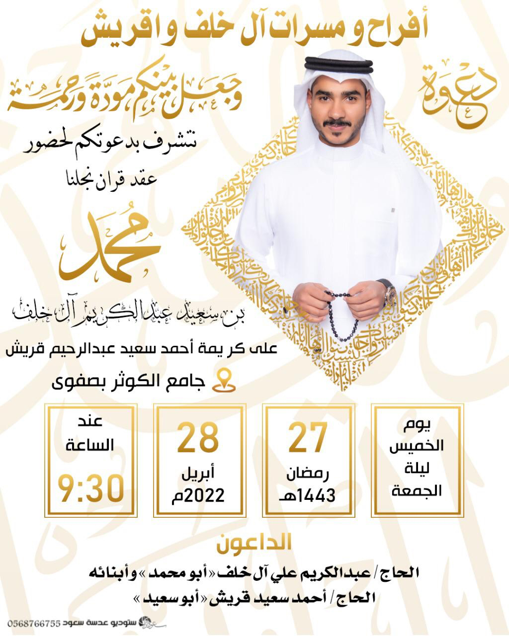 احتفلت عائلة آل خلف واقريش في صفوى مساء يوم الخميس 27 رمضان بعقد قران الشاب محمد سعيد عبد الكريم علي آل خلف على كريمة الحاج أحمد سعيد عبد الرحيم قريش في جامع الكوثر بصفوى وسط فرحة الأهل والأصدقاء ومحبي العريسين.
