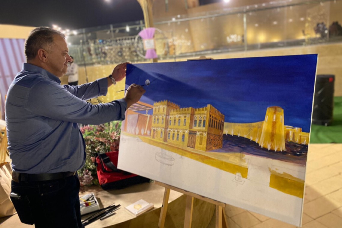 أبهر التشكيلي اللبناني إيهاب ترو، الزوار، من خلال إبداعه في تنفيذ لوحة ”بيت العمدة“ في الهواء الطلق وذلك ضمن فعاليات ليالي الرامس التي تقيمها شركة اجدان للتطوير العقاري في وسط العوامية.