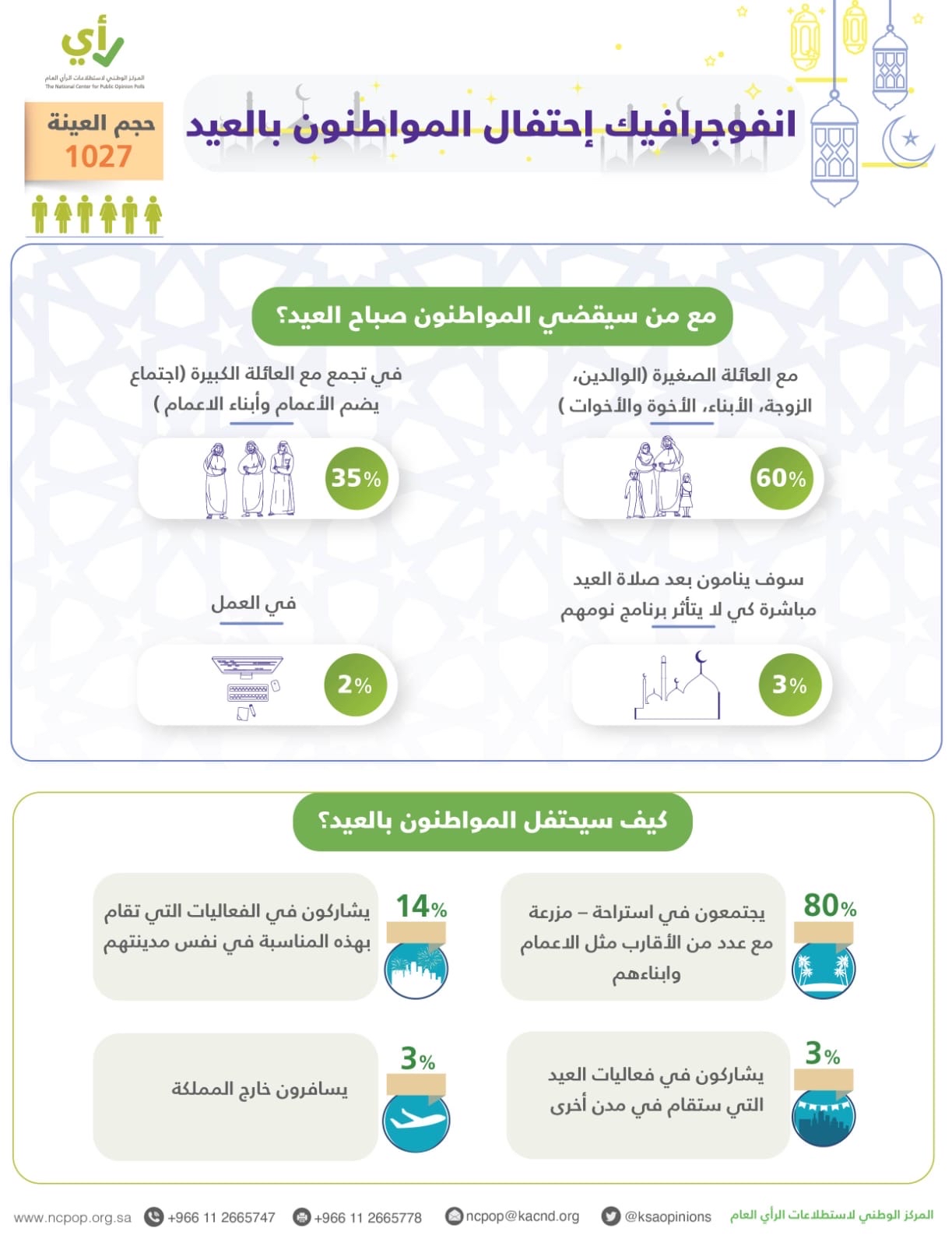 وجاءت نتائج الاستطلاع على النحو التالي: 60% سيقضون صباح العيد مع العائلة الصغيرة الوالدين، الزوجة، الأبناء، الأخوة والاخوات و35% في تجمع مع العائلة الكبيرة الاعمام وأبناء الاعمام، و3% سوف ينامون بعد صلاة العيد مباشرة كي لايتأثر برنامج نومهم، و2% في العمل.