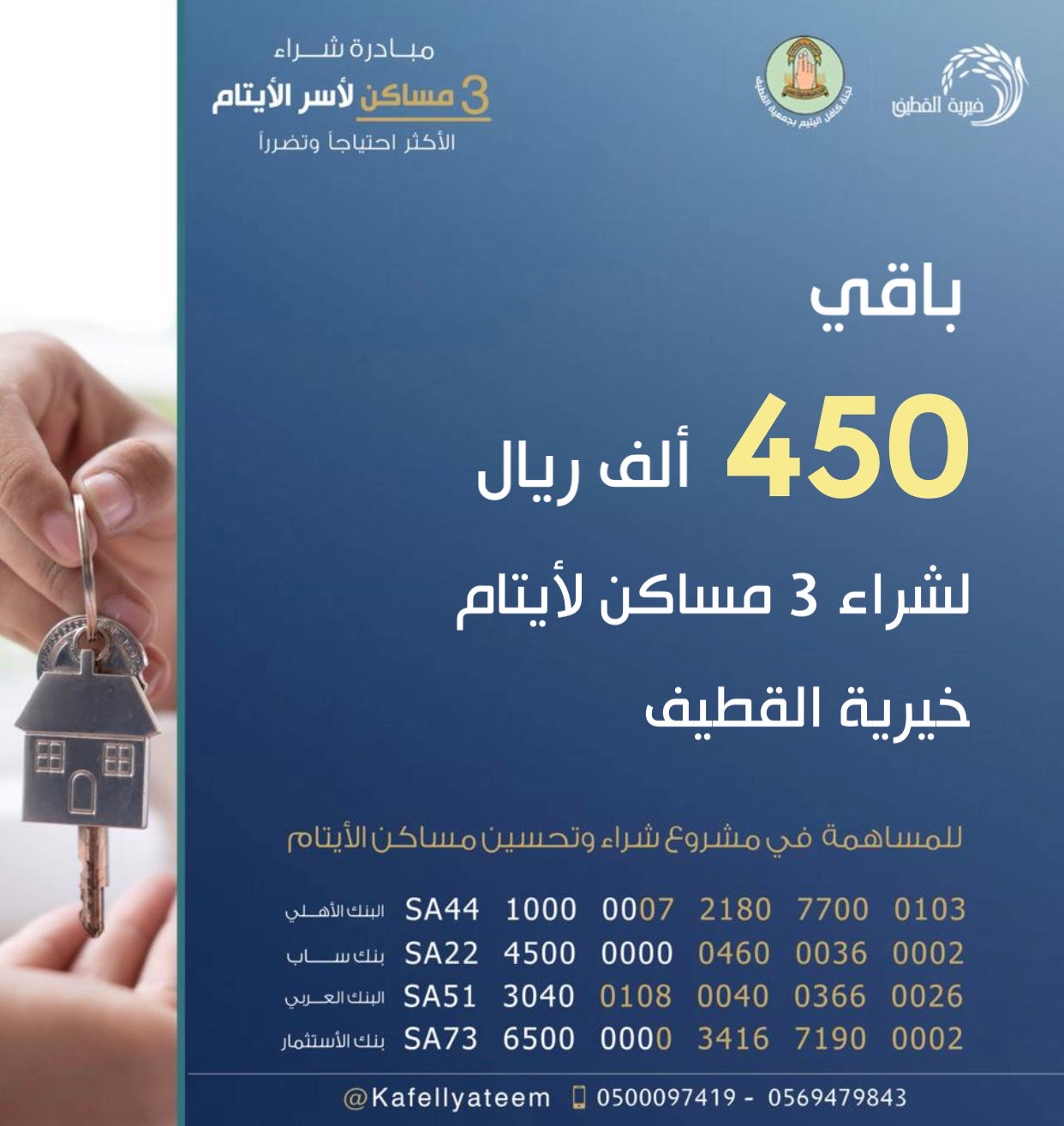 استقبلت لجنة كافل اليتيم بخيرية القطيف 850 ألف ريال منذ إعلان مبادرة شراء 3 مساكن للأيتام في 20 رمضان، ساهم بها المحسنون في هذا الشهر الكريم، وذلك من أصل مليون و300 ألف ريال.