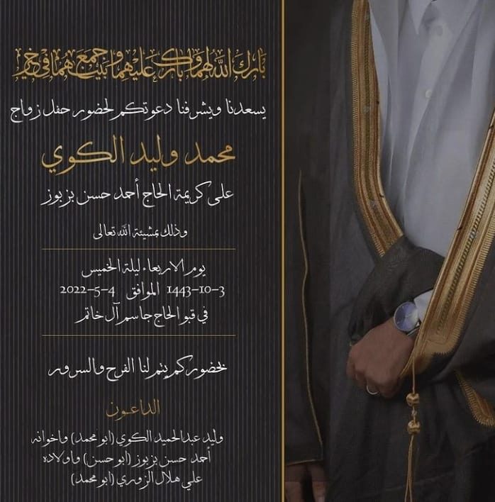 تحتفل عائلة الكوي وبزبوز في تاروت مساء يوم الأربعاء 3 شوال بزفاف الشاب محمد وليد عبد الحميد الكوي على كريمة الحاج أحمد حسن بزبوز في قبو الحاج جاسم آل خاتم وسط فرحة الأهل والأصدقاء ومحبي العريسين.