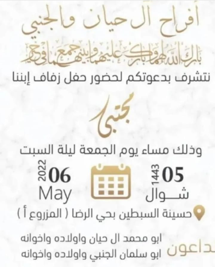 تحتفل عائلة آل حيان و الجنبي في تاروت مساء يوم الجمعة 5 شوال بزفاف الشاب مجتبى آل حيان في حسينية السبطين بحي الرضا - المزروع أ - وسط فرحة الأهل والأصدقاء ومحبي العريسين.