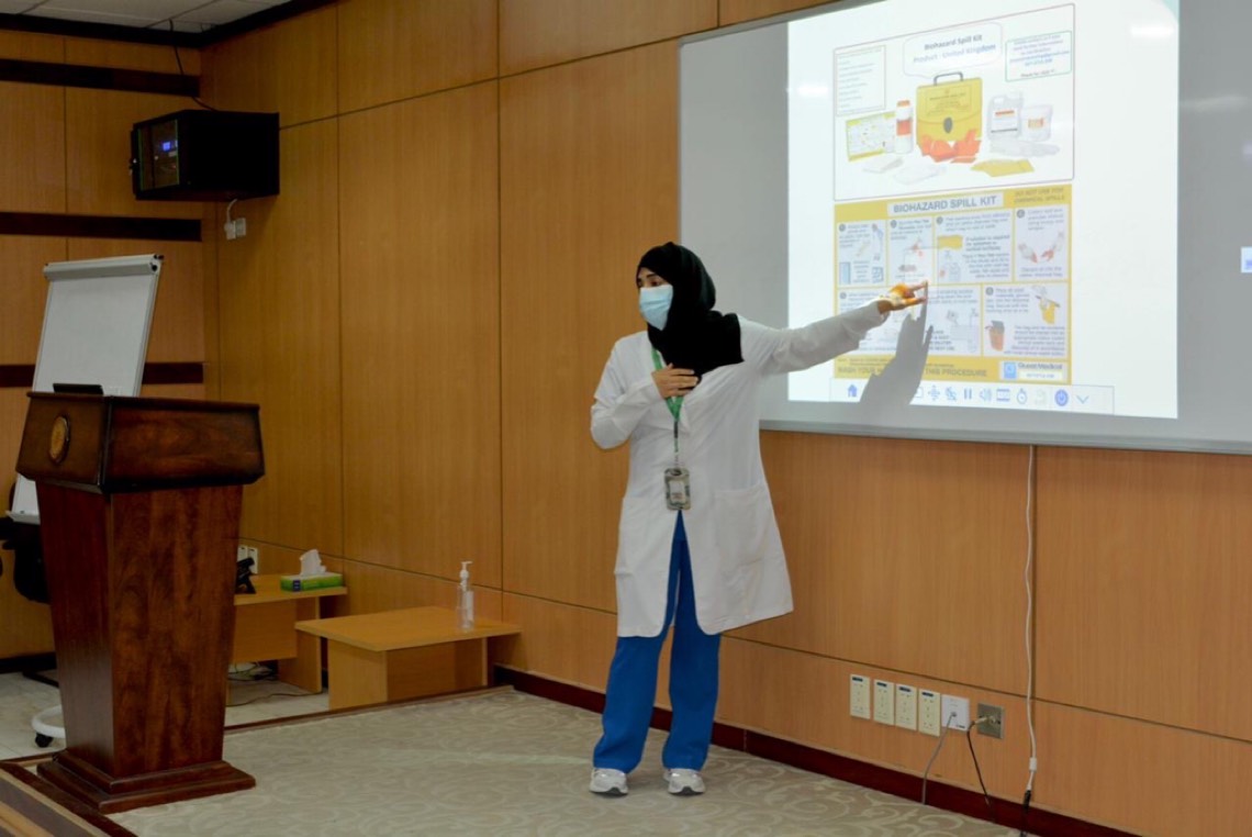 جاء ذلك بهدف تحسين الأداء للعاملين بالمستشفى وحمايتهم والمرضى من العدوى، وتضمن البرنامج التدريب على الطرق الصحيحة لتطهير الأيدي وطرق لبس وخلع وسائل الحماية الشخصية واجتياز اختبار الكمام عالي الكفاءة