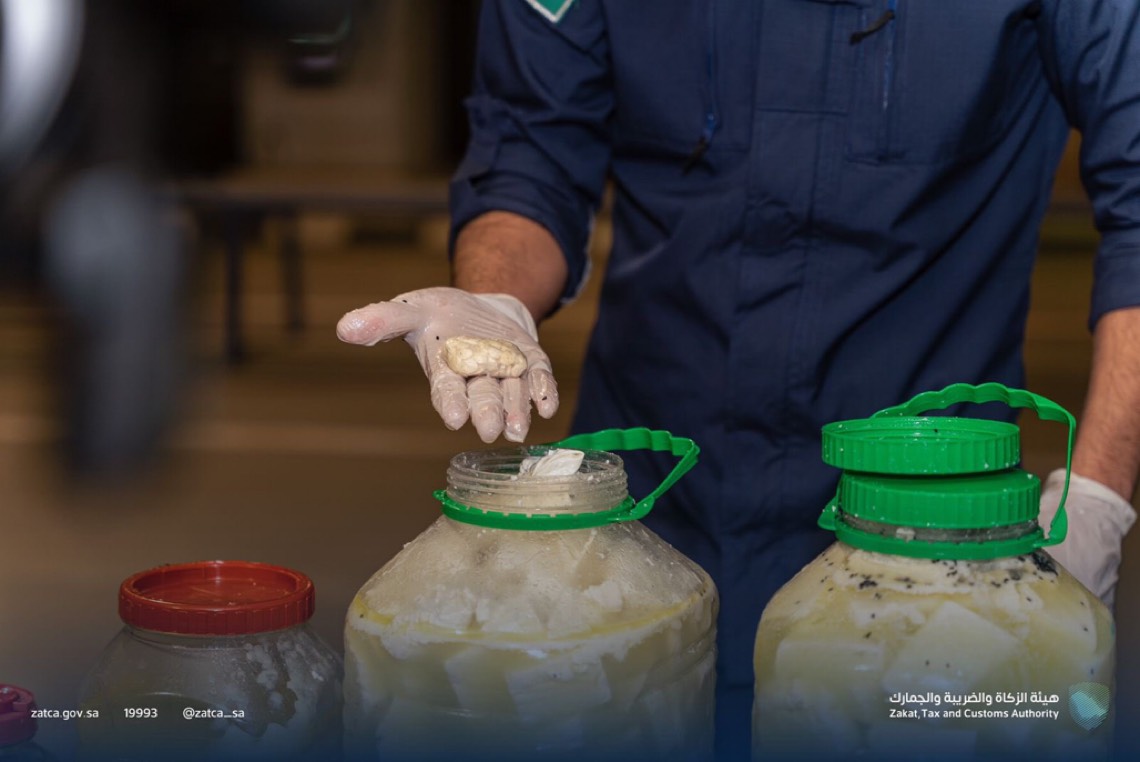 وأوضحت الهيئة أنه أثناء إجراء عملية الكشف والمعاينة لإحدى المركبات القادمة من نوع ”خصوصي“، عُثر على 29,000 حبة كبتاجون، كانت مُخبأة بطريقة فنية، وذلك بإخفاء الحبوب في قفازات بلاستيكية ووضعها داخل عُلب زجاجية تحتوي على أجبان، ومن ثم وضعها ضمن الأمتعة التي يحملها المُهرب في المركبة.
