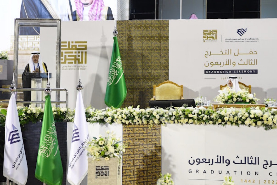 جامعة الإمام عبد الرحمن بن فيصل للعام الجامعي 1443/1444ه قائلاً: «مناسبة غالية على القلوب نعيشها هذا المساء، ونستهِلُّها بعد شكر الله على تمام الجهد، وبلوغ الحصْد، بالحفاوة والترحيب بكم ياصاحب السمو، راعيًا لحفل تخريج الدفعة الثلاثة والأربعين من أبنائك طلاب جامعة الإمام عبدالرحمن بن فيصل، ومشاركًا بكريم عنايتك التي طالما حظيت بها الجامعة فرحتنا هذا العام بإهداء الوطن «1154» خريج، كما يسعدني الترحيب بجميع من شرَّفنا بحضوره وشاركنا فرحة هذا المساء».