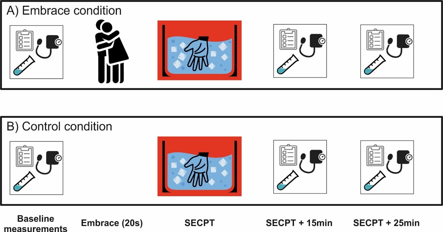 الشكل: A» في حالة العناق، قام المشاركون بملء الاستبيانات وقدموا عينات لقياس خط الأساس للكورتيزول وضغط الدم والحالة العاطفية قبل بدء التجربة. وبعد ذلك، تم العناق لمدة 20 ثانية في غياب المختبِر. بعد العناق، خضع الأزواج لاختبار الماء البارد SECPT في وضع مجموعة مع دورة قياس أخرى للكورتيزول وضغط الدم والحالة العاطفية. بعد 15 و25 دقيقة من اختتام اختباز الماء البارد SECPT، تم إجراء قياس آخر. B» كما هو الحال في A»، ولكن لم ي - ري أي عناق بين الشركاء قبل اختبار الماد البارد SECPT.