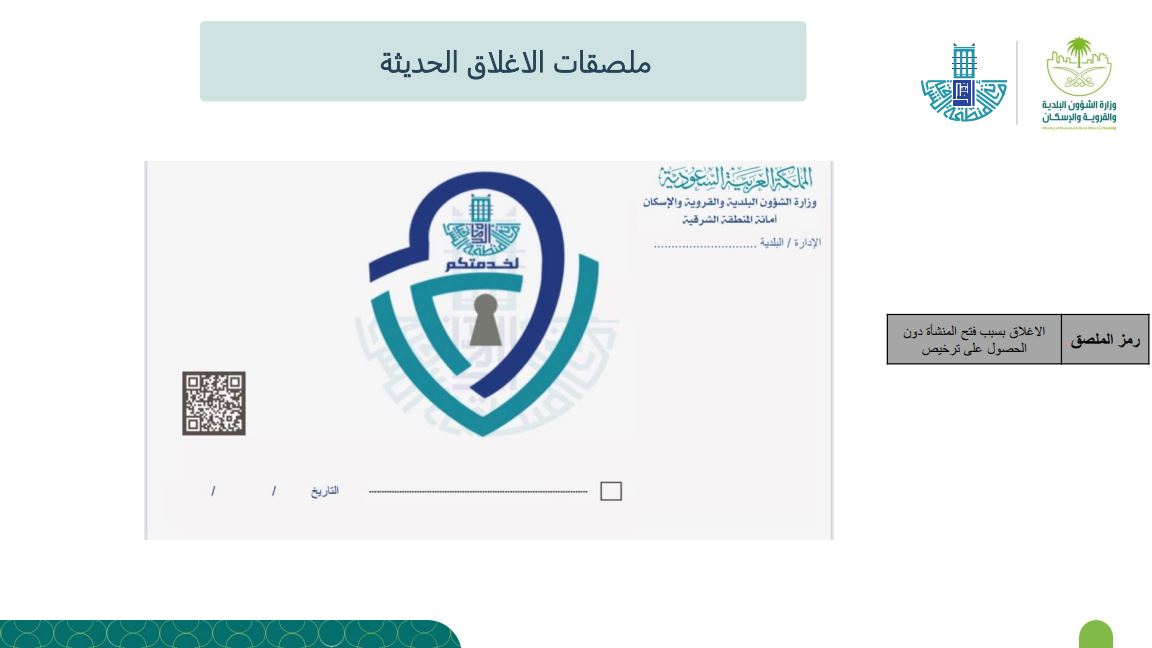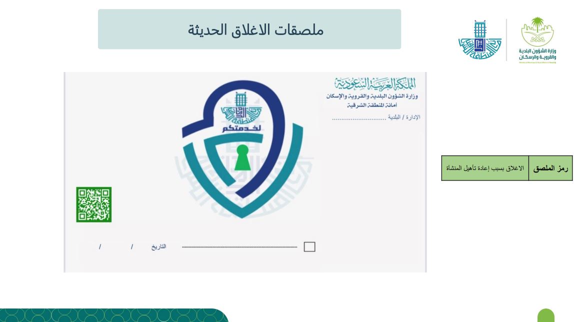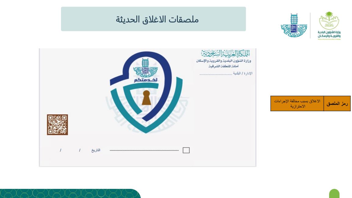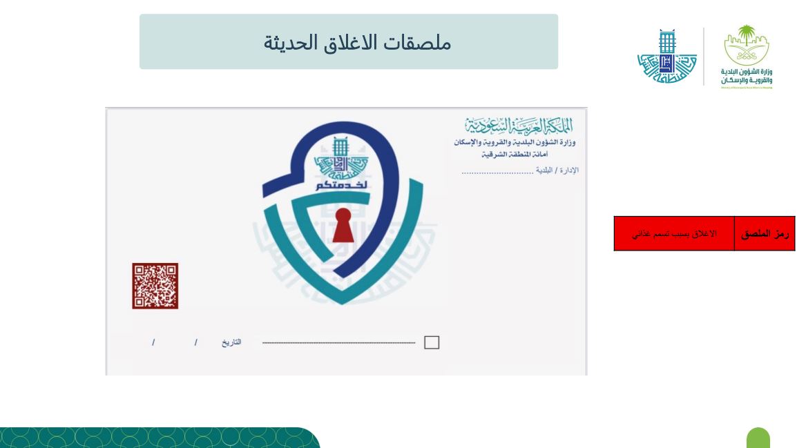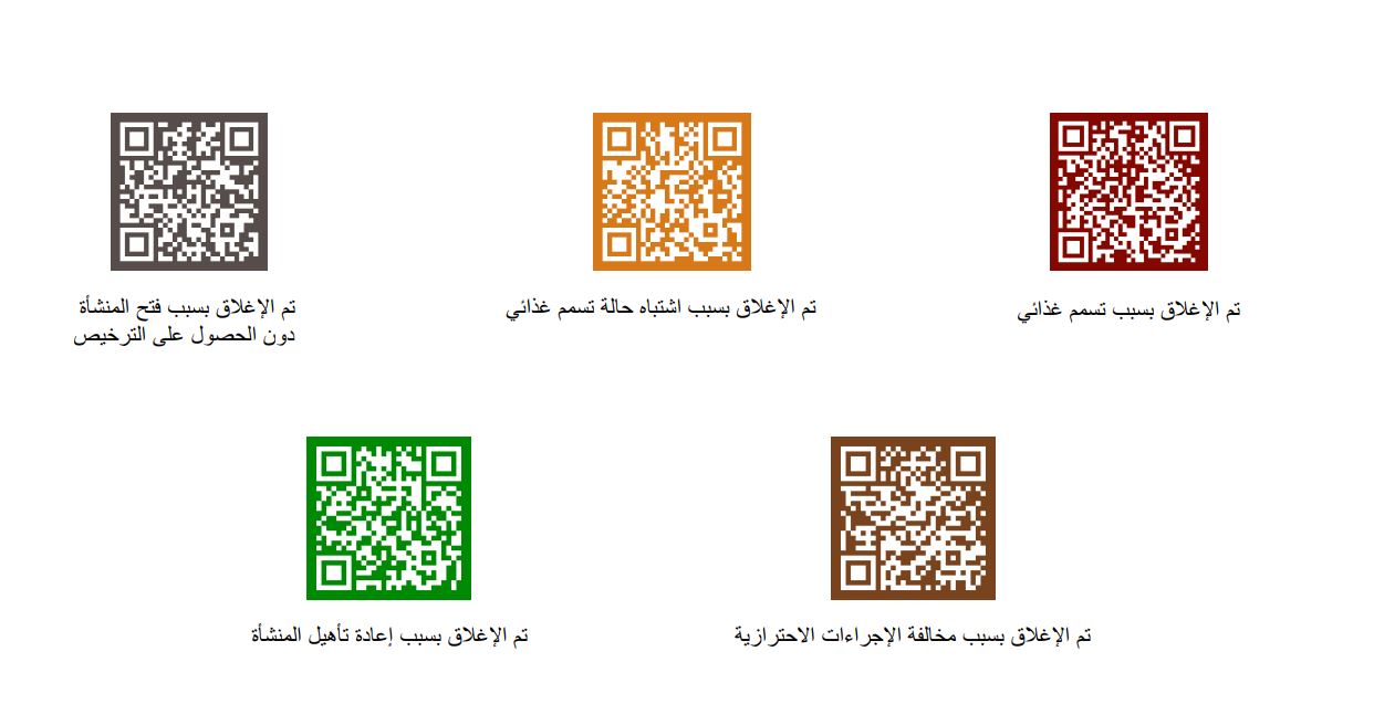 وتأتي الخطوة لتغيير مفهوم إجراءات الإغلاقات التقليدية، كما تم تخصيص 5 ألوان لكل نوع مخالفة سجلت على المنشأة المغلقة، ويرمز كل لون ما بين إغلاق بسبب تسمم غذائي، أو الاشتباه بحالات تسمم، أو إغلاق لإعادة تأهيل المنشأة، أو مخالفة بسبب فتح المنشأة دون الحصول على التراخيص، أو تم إغلاقها لمخالفتها للإجراءات الاحترازية.