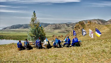 يقوم الشامان من منظمة تينغري Tengeri بإجراء طقوس تقديم القاربين في عام 2013 إلى بوخي باتور Bukhe Bator، سيد روح نهرسلنغا Selenga، جمهورية بورياتيا، الاتحاد الروسي