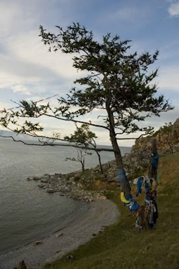 الصورة: القماش المربوط حول جذع الشجرة يشير إلى الموقع الذي يمكن للناس فيه تقديم القرابين لكائن حي يعيش ضمن ذلك المشهد الطبيعي [18]  في جزيرة أولخون، إيركوتسك أوبلاست، الاتحاد الروسي. مصدر الصورة: روبرتو كويجادا