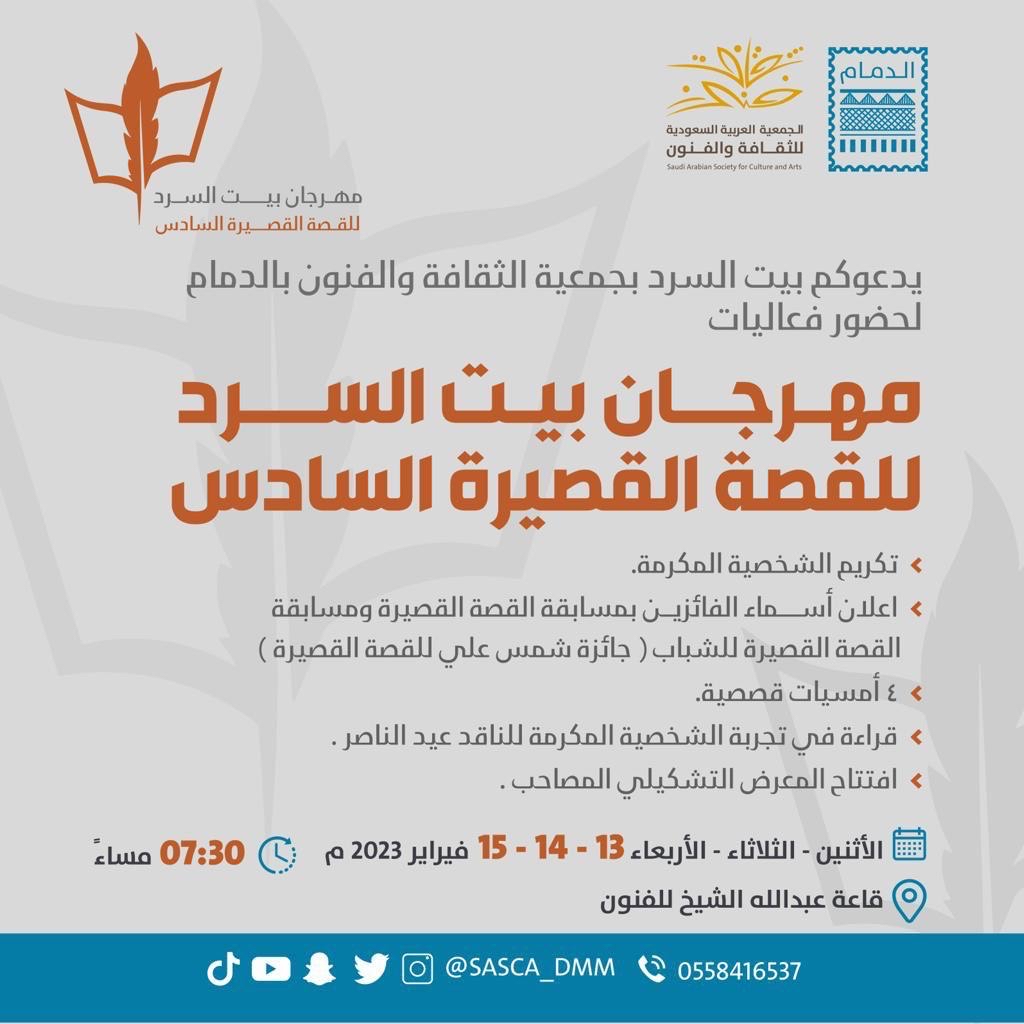 ينطلق مهرجان بيت السرد للقصة القصيرة السادس يوم الاثنين المقبل بجمعية الثقافة والفنون بالدمام وذلك لإعلان الفائزين بمسابقاته وفعاليات أخرى.