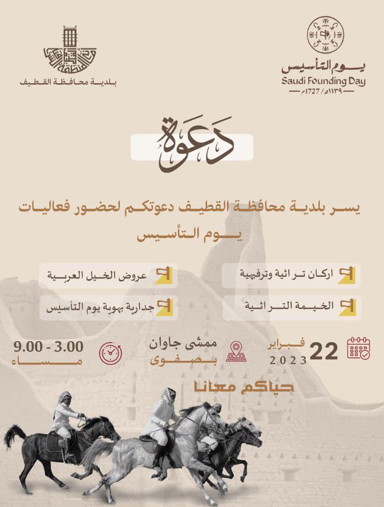 دعت بلدية محافظة القطيف، المواطنين، لحضور فعاليات يوم التأسيس في ممشى جاوان في صفوى، بمناسبة يوم التأسيس.