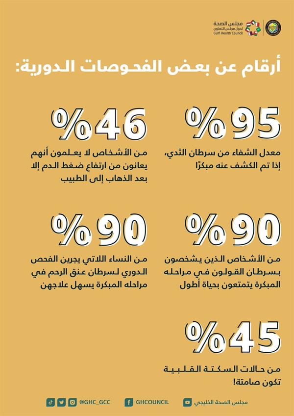 أكد مجلس الصحة لدول مجلس التعاون الخليجي، أهمية إجراءات الفحوصات الدورية بشكل منتظم، لما لها من أهمية قصوى في الكشف المبكر عن بعض الأمراض الخطيرة، وبالتالي سرعة علاجها.