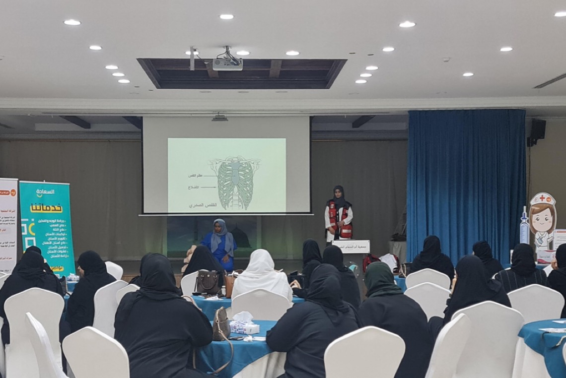 حضرت الورشة 25 سيدة، وقدمتها المدربة ثرياء البركاتي وأخصائية طب الطوارئ شروق المياد.