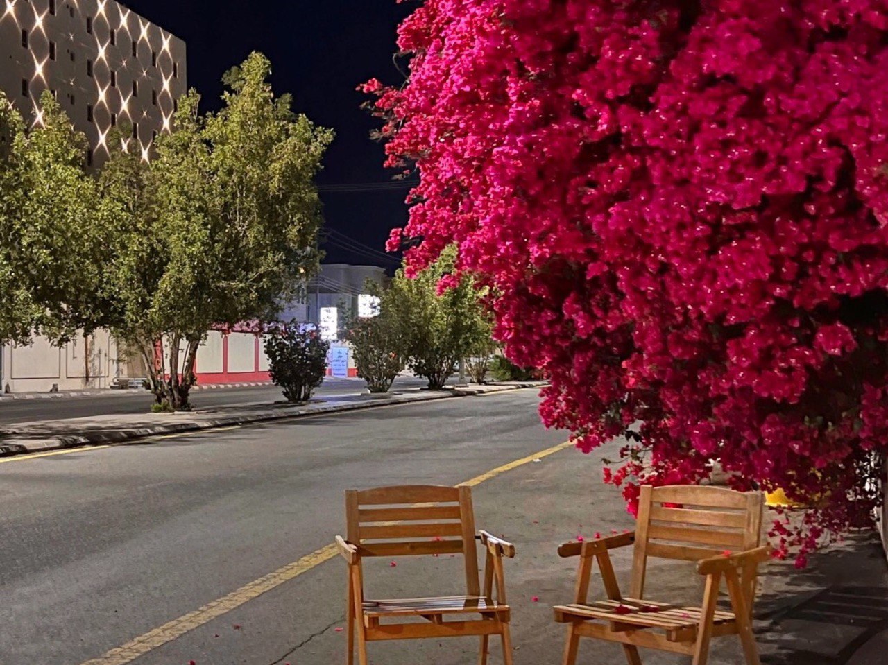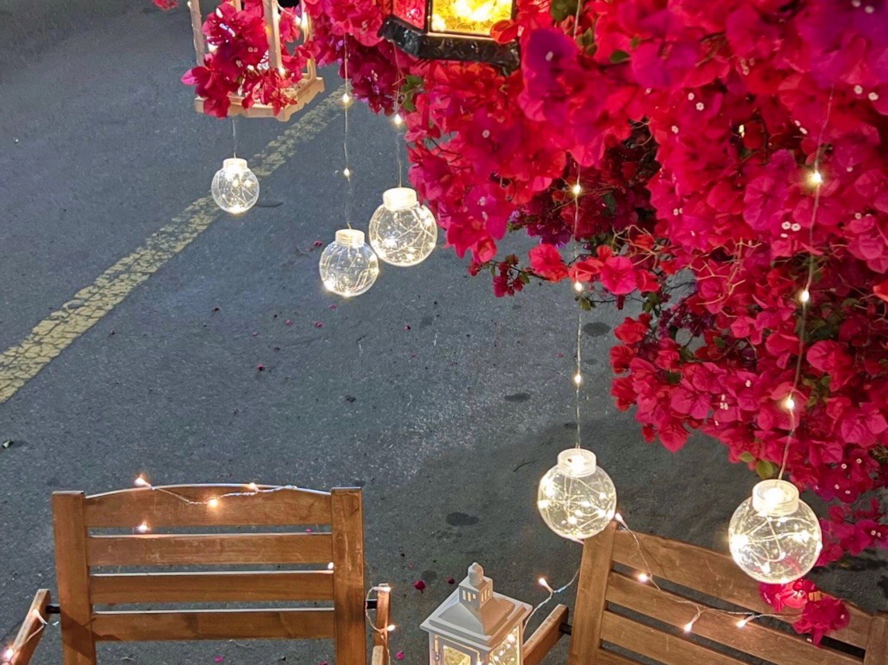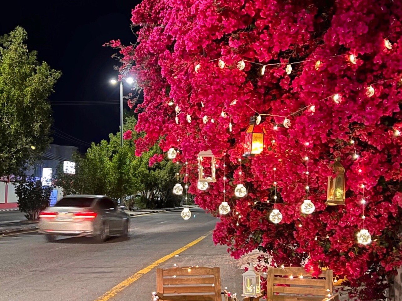 بادر شابٌ يهوى تنسيق الديكور، بتعليق لمبات صفراء وفوانيس على شجرة جهنمية لمنزل أحد سكان مدينة حائل ووضع مقعدين تحتها، بنية التقاط بعض الصور لها.