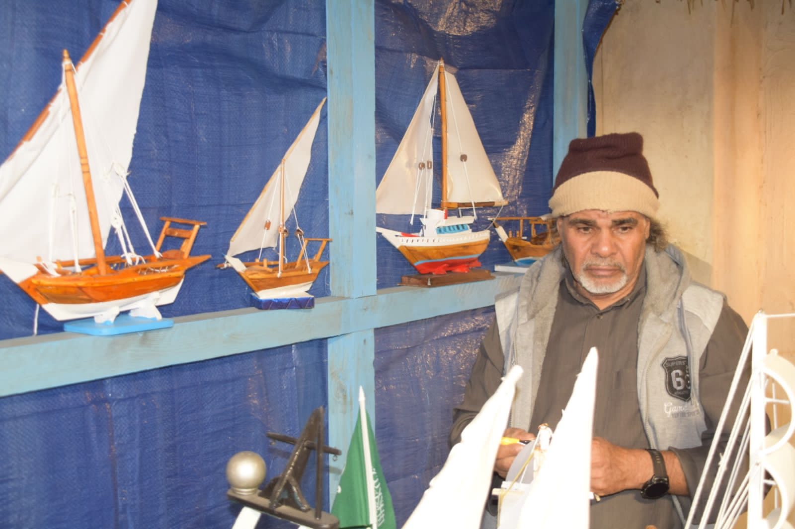 ويشارك يوسف علي القلاف أحد المشاركين في فعاليات مهرجان ”بستان قصر تاورت“، بركن ويعرض فيها عدد من السفن التي قام بتصميمها.