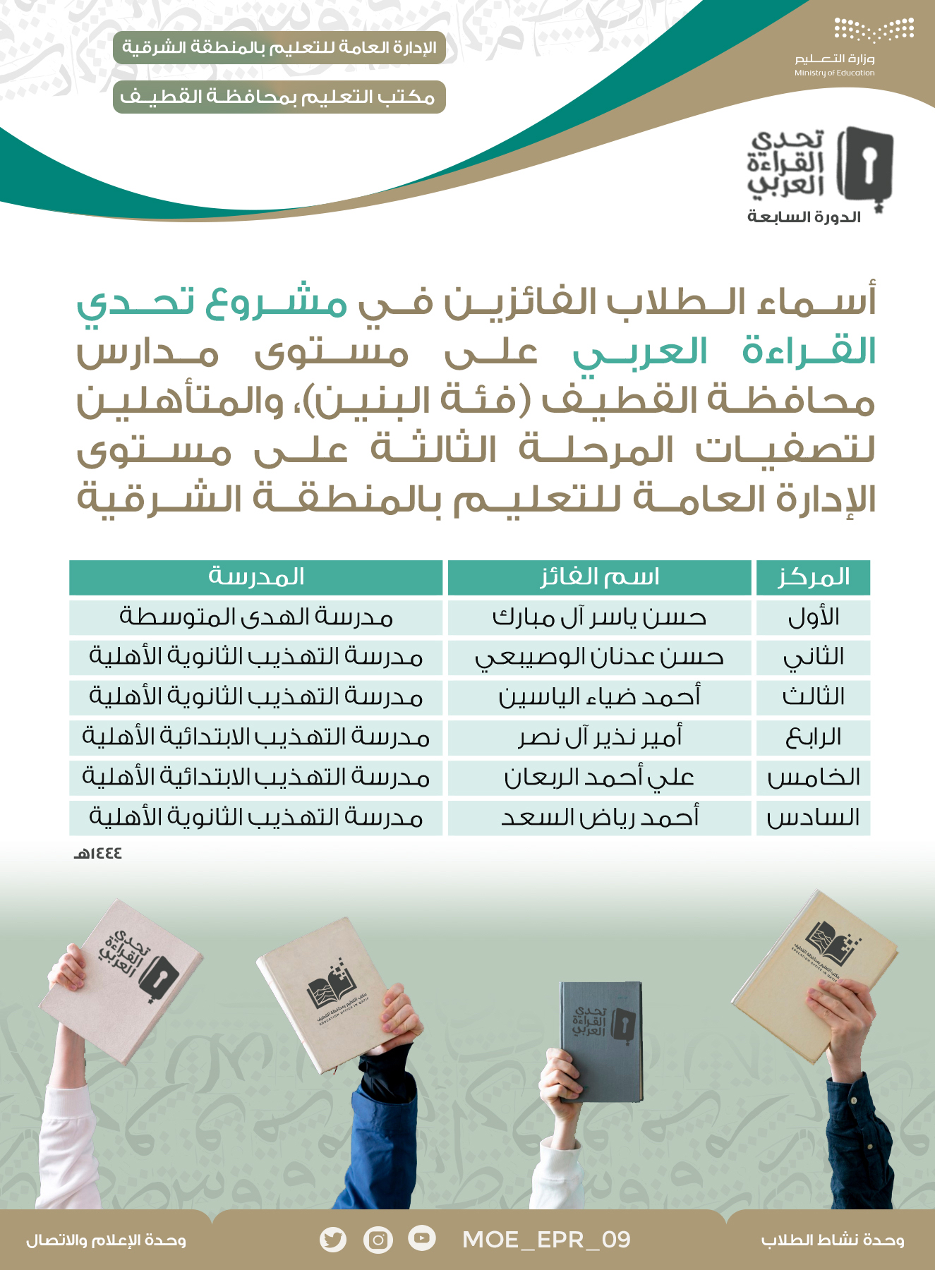 القطيف.. طلاب مدرسة التهذيب الثانوية يحصدون 5 مراكز متقدمة بتحدي القراءة