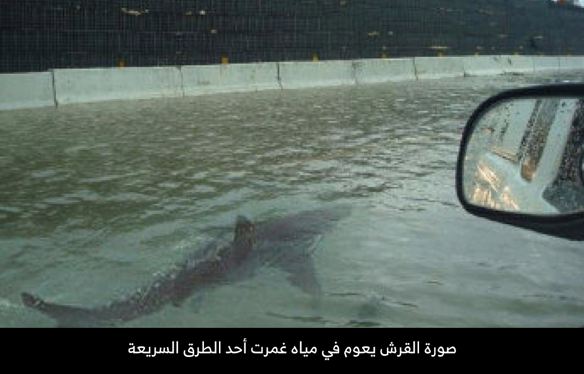 صورة تبرز مثل منظر قرش يعوم في طريق سريع مغمور بالمياه جعلت العديد من الناس يتداولونها بعد أن ضرب إعصار إيان فلوريدا في عام 2022. كما تم تداولها على نطاق واسع بعد أن ضرب إعصار هارفي هيوستن، تكساس، في عام 2017.